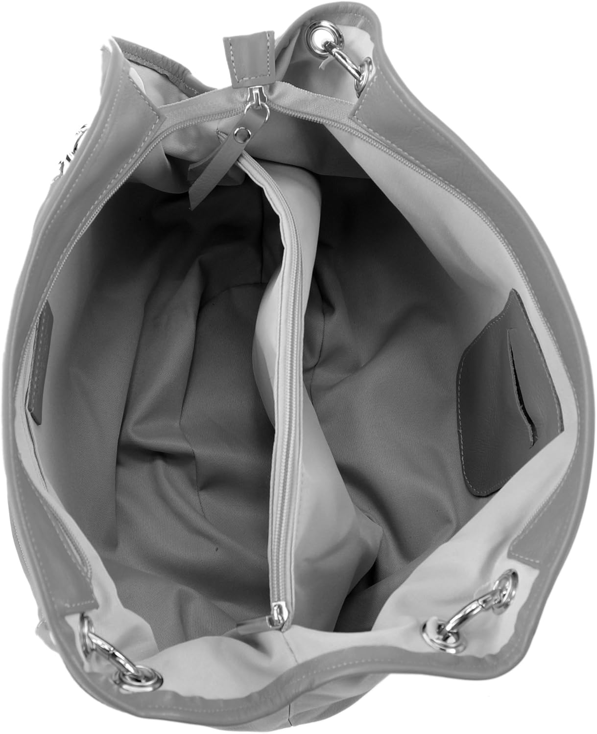 The Modamoda IT40LEDER is a handmade shoulder bag from Italy, designed with great attention to detail. Made from high-quality genuine leather, this handbag exudes elegance and functionality. The main compartment is divided by a zippered center section and offers ample space for your essentials. A zippered side pocket, a small slip pocket and a secure zippered pocket on the back offer convenient organization. The interior is lined with durable fabric, while silver-tone metal accents add a touch of elegance. This versatile handbag measures approximately 40 cm wide and 29 cm tall and features 2 removable handles for convenient carrying. Whether you're running errands or attending a formal event, the Modamoda IT40LEDER is a stylish and functional choice.