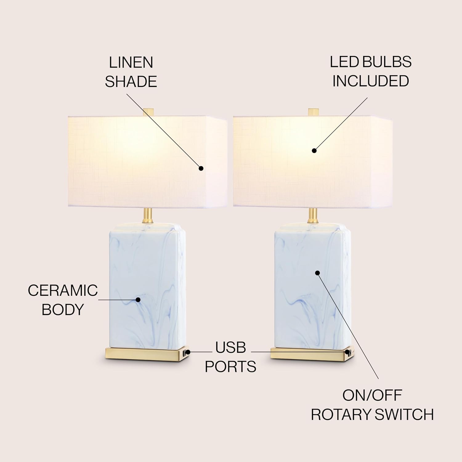 This chic pair of marbled ceramic lamps adds modern cottage style to any space. Rectangular shades are a perfect fit for a dining room console or bedroom chest. The handy USB charging ports make them ideal for vacation homes too.