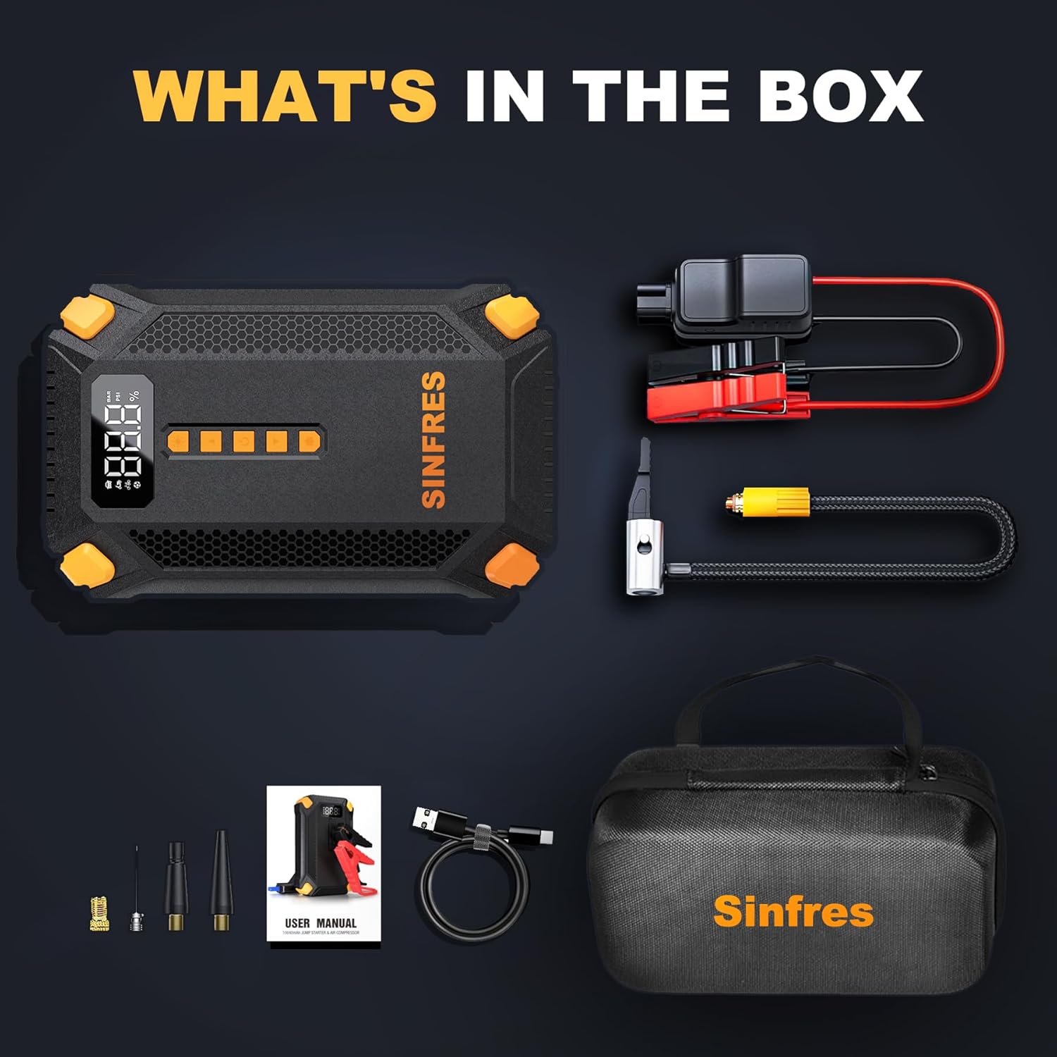 | Included Components | 1*Air Pump Hose, 4*Air Nozzles, 1*Jump Starter with Air Compressor, 1*Portable Storage Case, 1*User Manual, 1*Smart Jumper Cables, 1*USB-A to USB-C cable |