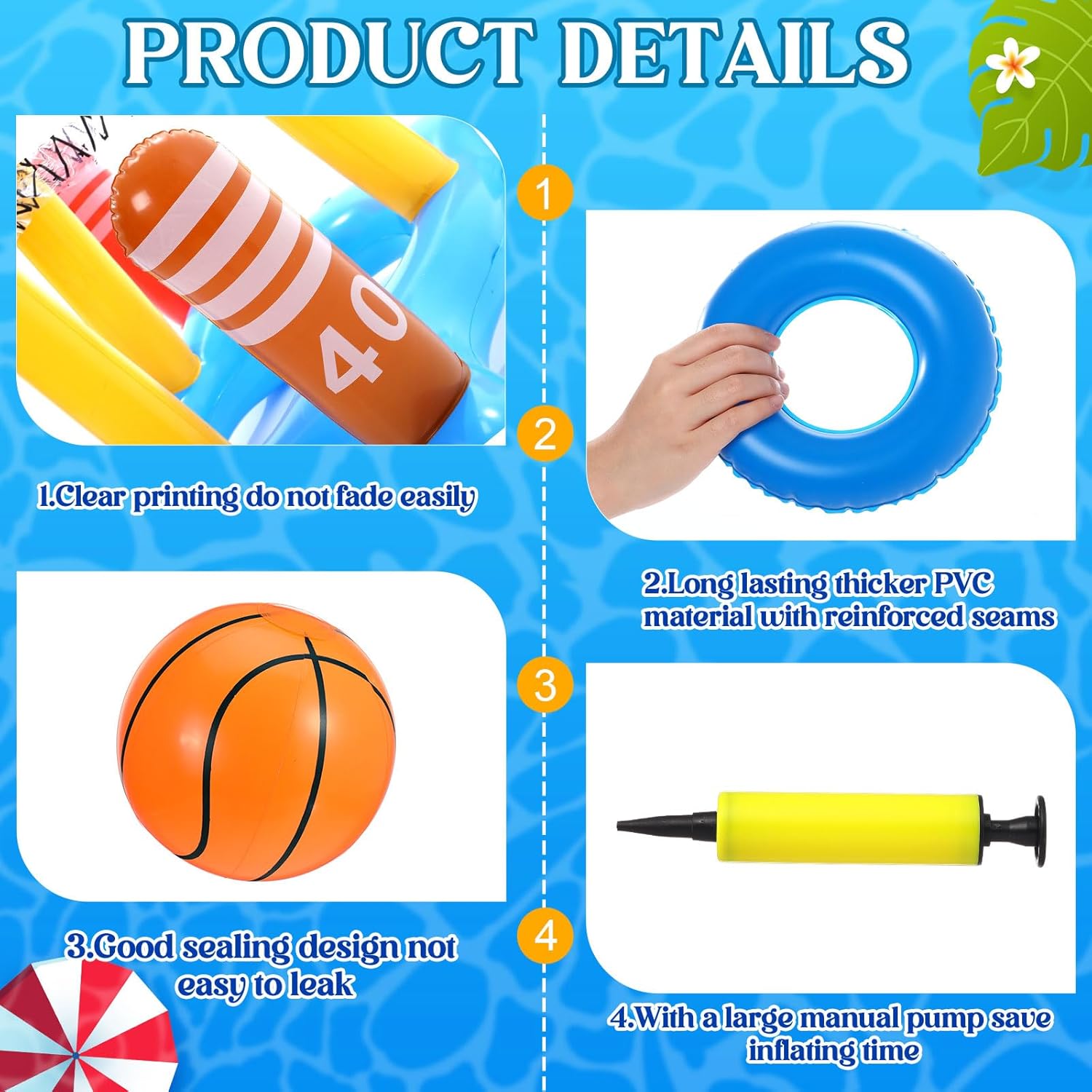 Features: Basic Gameplay Introduction: Gameplay 1: the player who hits the basketball the most times from the inflatable basketball hoop wins. Gameplay 2: the player who successfully loops the four posts on the inflatable basketball hoop first, or loops the most posts, or successfully loops the corresponding colors, wins the activity! Gameplay 3: in the Tic-Tac-Toe, the first player to connect 3 identical posts in a straight line wins. You can customize and create your own rules based on the basic play to suit different entertainment preferences and meet the needs of multiplayer interaction. Specifications: Material: PVC Color: multicolor Size: Basketball hoop: about. 16.54 x 26.77 x 19.69 inches/ 42 x 68 x 50 cm Inflatable ring: 7.48 inches/ 19 cm Inflatable basketball: 7.87 inches/ 20 cm Inflatable tic-tac-toe: 47.24 x 47.24 inches/ 120 x 120 cm Throwing things: 7.87 x 7.87 inches/ 20 x 20 cm Package includes: 8 x Inflatable swimming rings 1 x 2-in-1 pool basketball hoop, manual air pump. 2 x Pool basketballs 1 x Inflatable tic-tac-toe(containing 10 inflatable throwing things) Notes: Manual measurement, please allow slight errors on size. The color may exist a slight difference due to different screen displays
