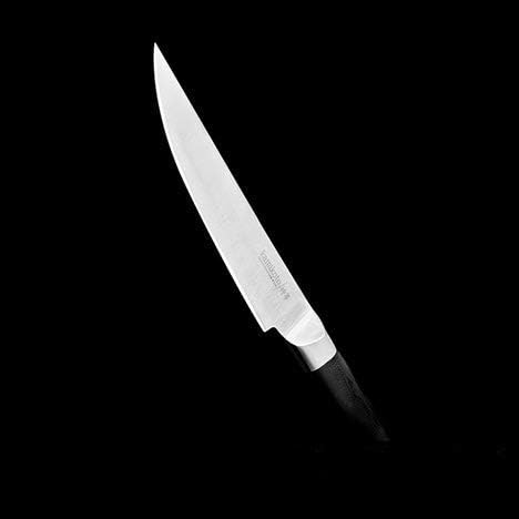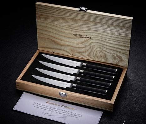Continuing Japanese tradition, the blade of the Kamikoto Steak Knife is non-serrated and sharpened into an 11° angle. Handcrafted through a process refined over generations, it cuts through steak without sawing. This way more capillaries of the meat remain intact, retaining more juices of the meat inside.