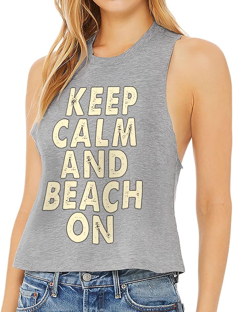 Cute and flattering Keep Calm and Beach on Racerback Cropped Tank is suitable for most indoor or outdoor activities, such as gym, yoga, running, hiking, beach or relaxing around the house. Pair Trendy Women's Tank with your favorite sports bras, especially strappy ones, and high-waisted leggings, then you will enjoy cool and comfortable exercise throughout the summer.