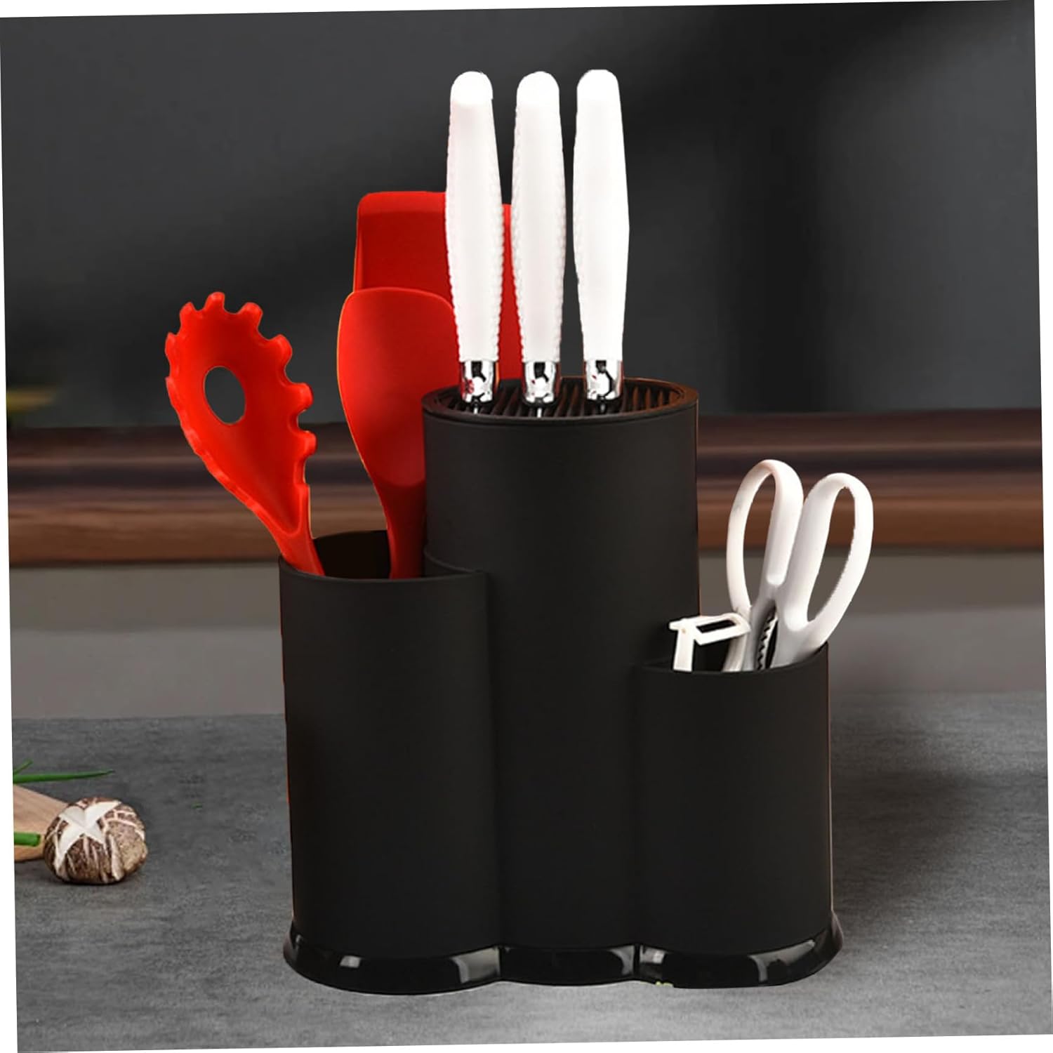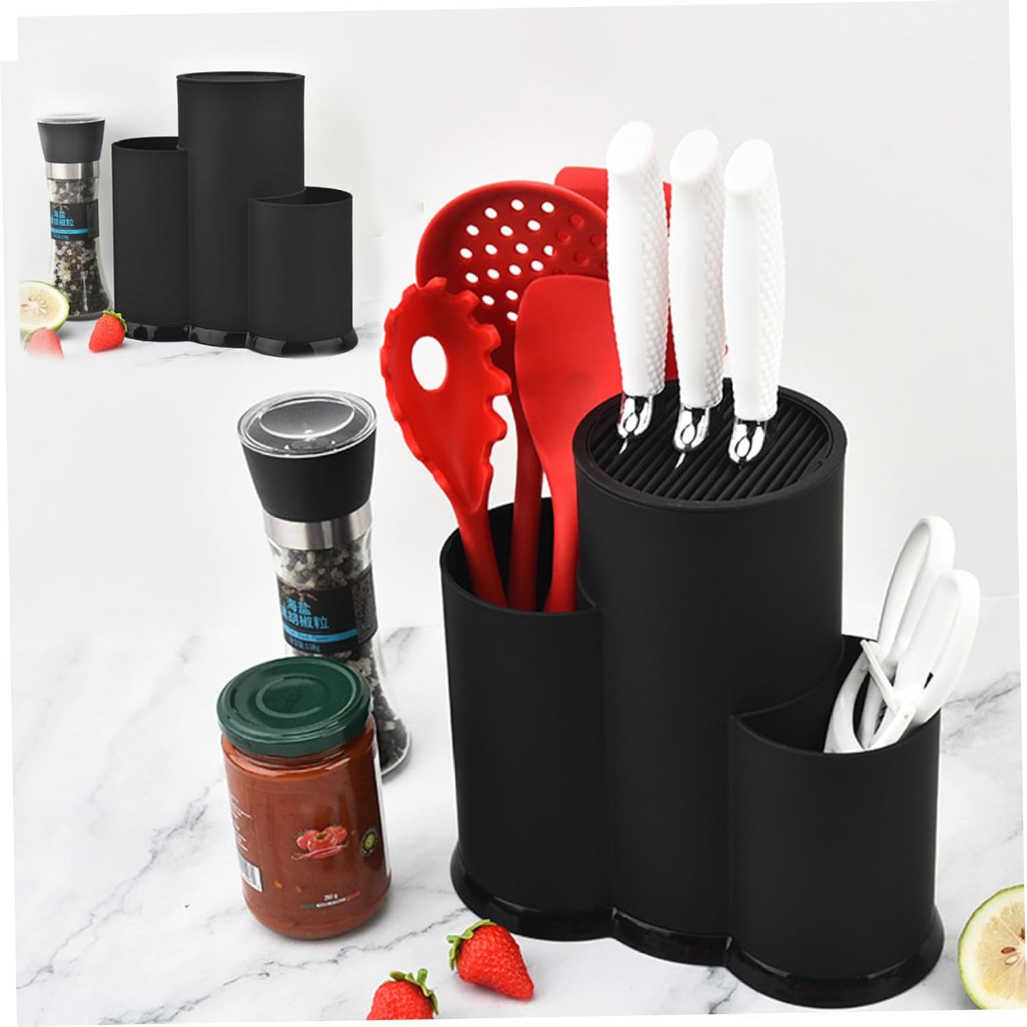 Description: Our knife block without knives adopt a partitioned design, which can reasonably store props, scissors and other kitchen utensils. The clear and distinct areas are placed for easy access during use. The detachable design of this knife holders for counter top makes it easy to clean. After use, remove the top cover and rinse it with water, drain it and use it again. Multi-compartment storage can not only efficiently store needed utensils, but also keep the kitchen environment tidy and maintain a clean atmosphere at home. Features: Knife Set with Block Color: Black. Material: PP. Size: about 23.2*22.5*11cm / 9.13*8.9*4.33inch. Weight: 473g. Note: Manual measurement, please allow slight errors on size. The colors may exist slight difference due to different screens. Package Including 1 * Knife Set with Block