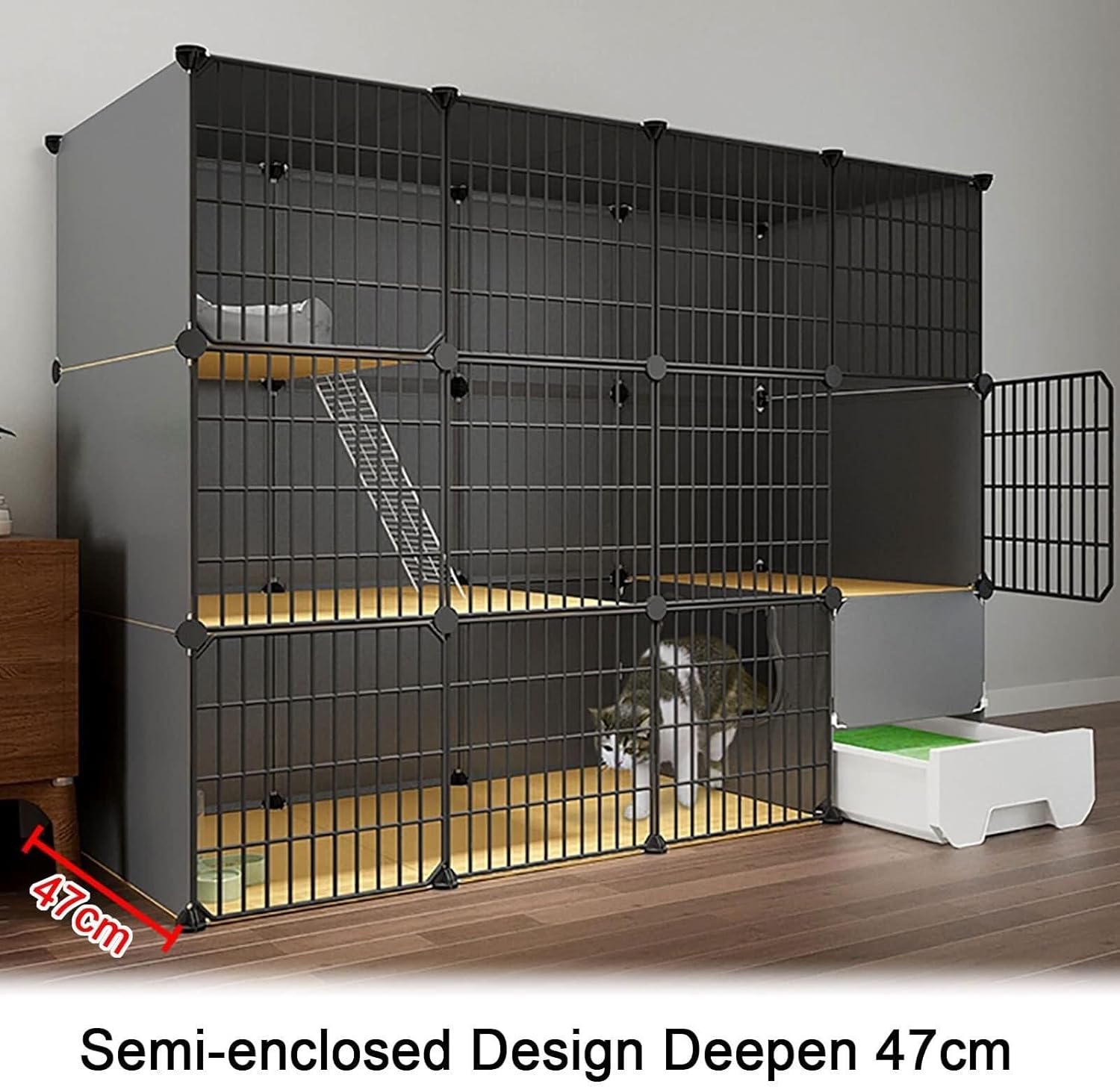 Welcome to the ultimate indoor playground for your pets! This Large Indoor Cat Cage with Litter Box features a multi-tier design that offers plenty of space for your cats or small animals to climb, play, rest, and stay healthy. Designed for 1 to 3 cats or a variety of small pets like guinea pigs, ferrets, rabbits, and more, this cage ensures they have a safe and stimulating environment.Constructed from metal and durable resin partitions, the cage is reinforced with upgraded stability buckles for added sturdiness and long-lasting use. Multiple cat doors provide convenient access for feeding, cleaning, and interacting with your pets without disturbing them.The DIY design allows you to customize and assemble the cage to perfectly fit your home’s layout and your pets’ preferences. The sturdy metal frame supports platforms that serve as resting and play areas, while included accessories such as a cat litter box, ladder, hammock, nest, bowl, and teaser enhance your pet’s comfort and entertainment.Color: blackMaterial: Metal, ABS PlasticSuitable: cats, guinea pigs and ferrets , Rabbits and other small petsPackage include:1x Cat cage with litter box1x Cat litter shovel1x Cat ladder1x Cat nest1x Cat hammock1x Cat bowl1x Cat teaser