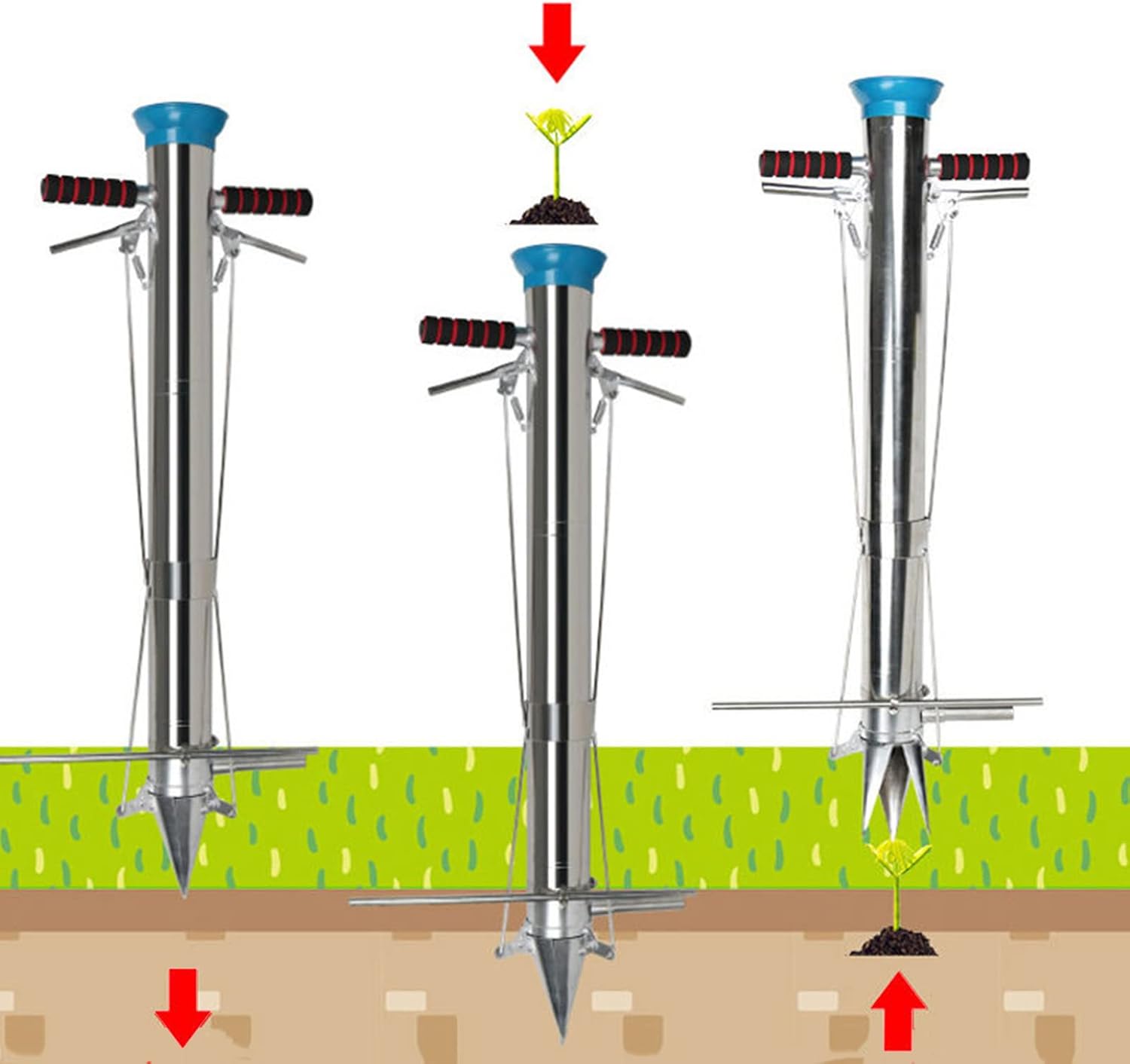 WHY CHOOSE US?1 Stainless steel material, not easy to rust, sturdy and practical.2. The head adopts the three-opening spire mode, which can quickly plan holes and bury holes, which greatly improves the planting speed.3. The height is in line with the reasonable height of human labor. You do not need to bend over during the planting process.4. The work efficiency of "planing holes, burying holes, breaking mulch, digging out seedlings and cofferdams is high, saving time and effort.PRODUCT PARAMETERMaterial: 216 Stainless steelApplicable crop types: fruits, vegetables, tobacco, potatoes, corn, beans, pepper, eggplant, cucumber, tomatoes, etc.Size: 90cm/3.0ft(Height)*7.6cm/0.25ft(Diameter)(Please see the picture)Package Size: 93*36*13cmPACKAGE1 * Handled Bulb Planter Tools⚠️NOTICE1. This product can plant seedlings cultivated in 32-hole-128-hole plug trays, or other suitable seedlings2. This product is suitable for dry land cultivation or sandy land rather than Wetland.⚠️NOTESThe methods of planting seedlings of different crops of different reproductive ages on different shoe uppers are different. Please master them according to the depth of planting and plant spacing.