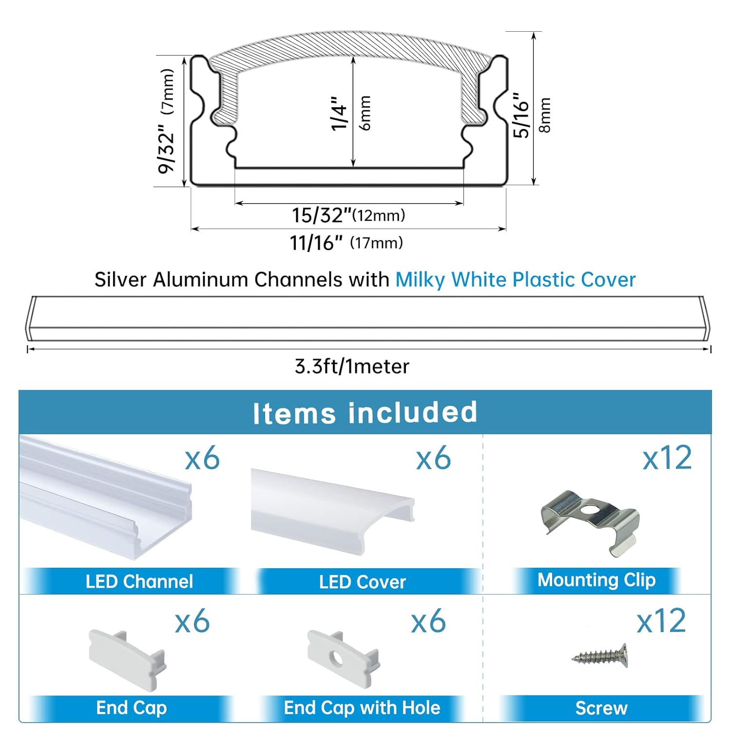 Item includes: 6PACK silver aluminum LED channel (1M (3.3ft) for each one, 6M/19.8ft in total), 6PACK milky white diffuser(1M (3.3ft) for each one, 6M/19.8ft in total), 24PACK end caps, 24PACK mounting clips, 36PACK screws