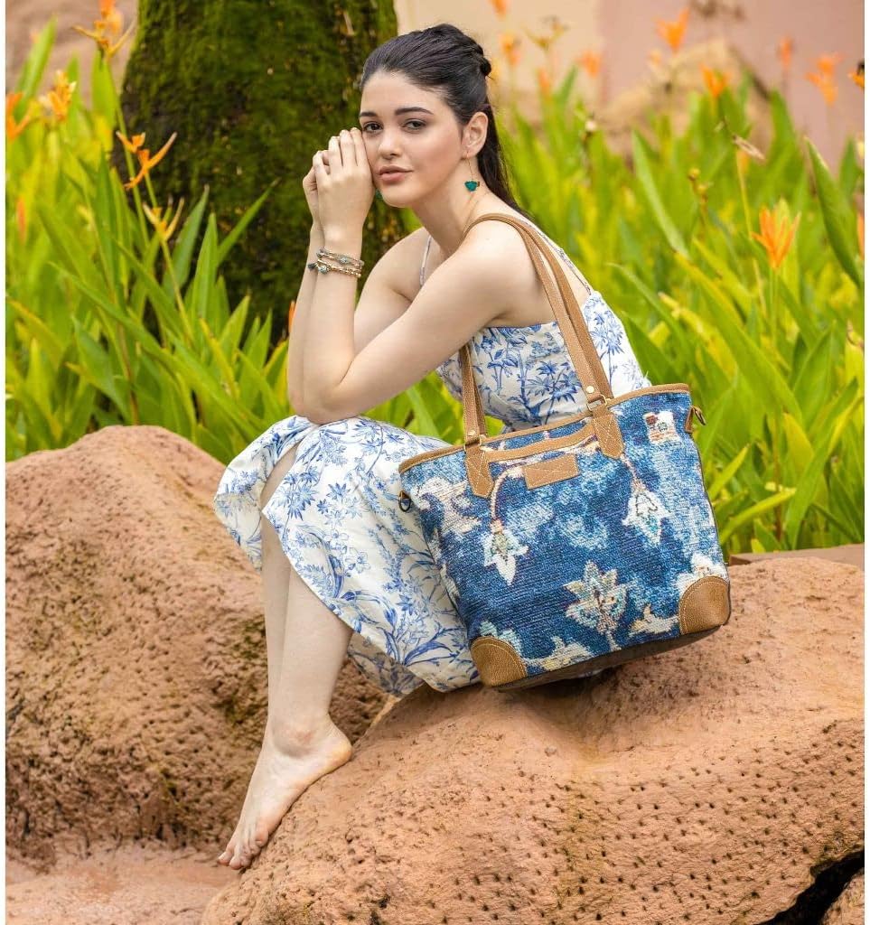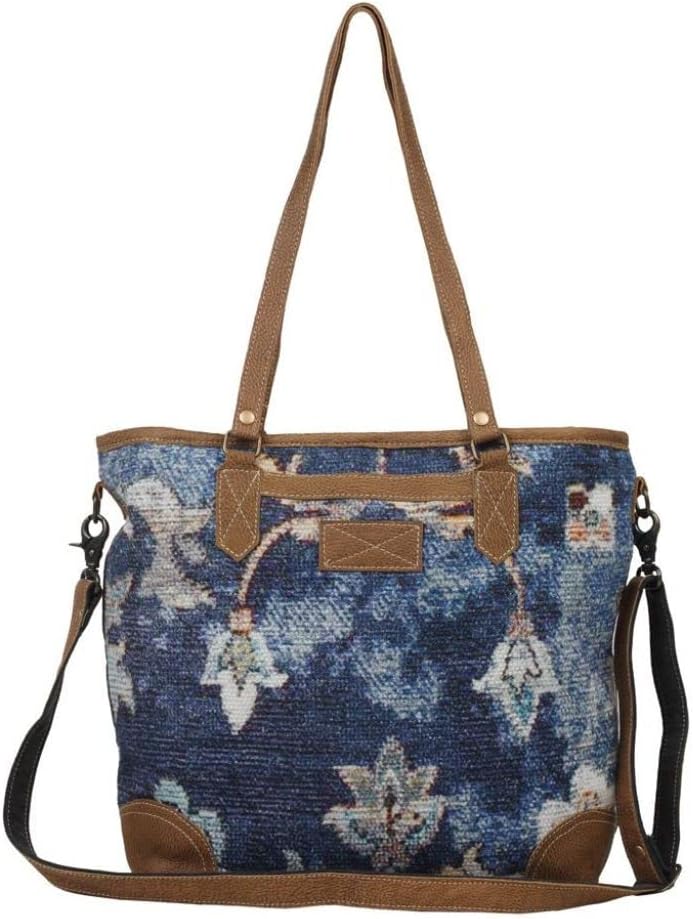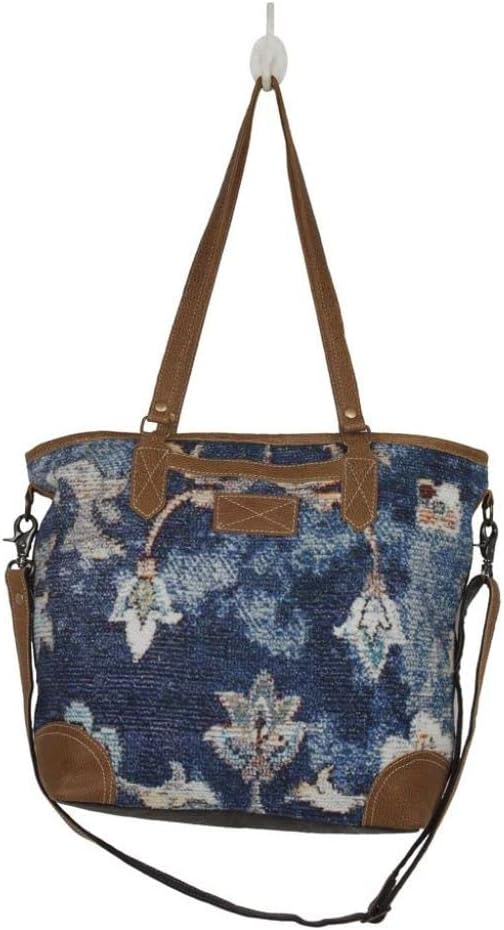 Become a proud owner of this bag crafted with a beautiful rug, leather slits on the bottom edges with two straps, and a zippered pocket at the backside.