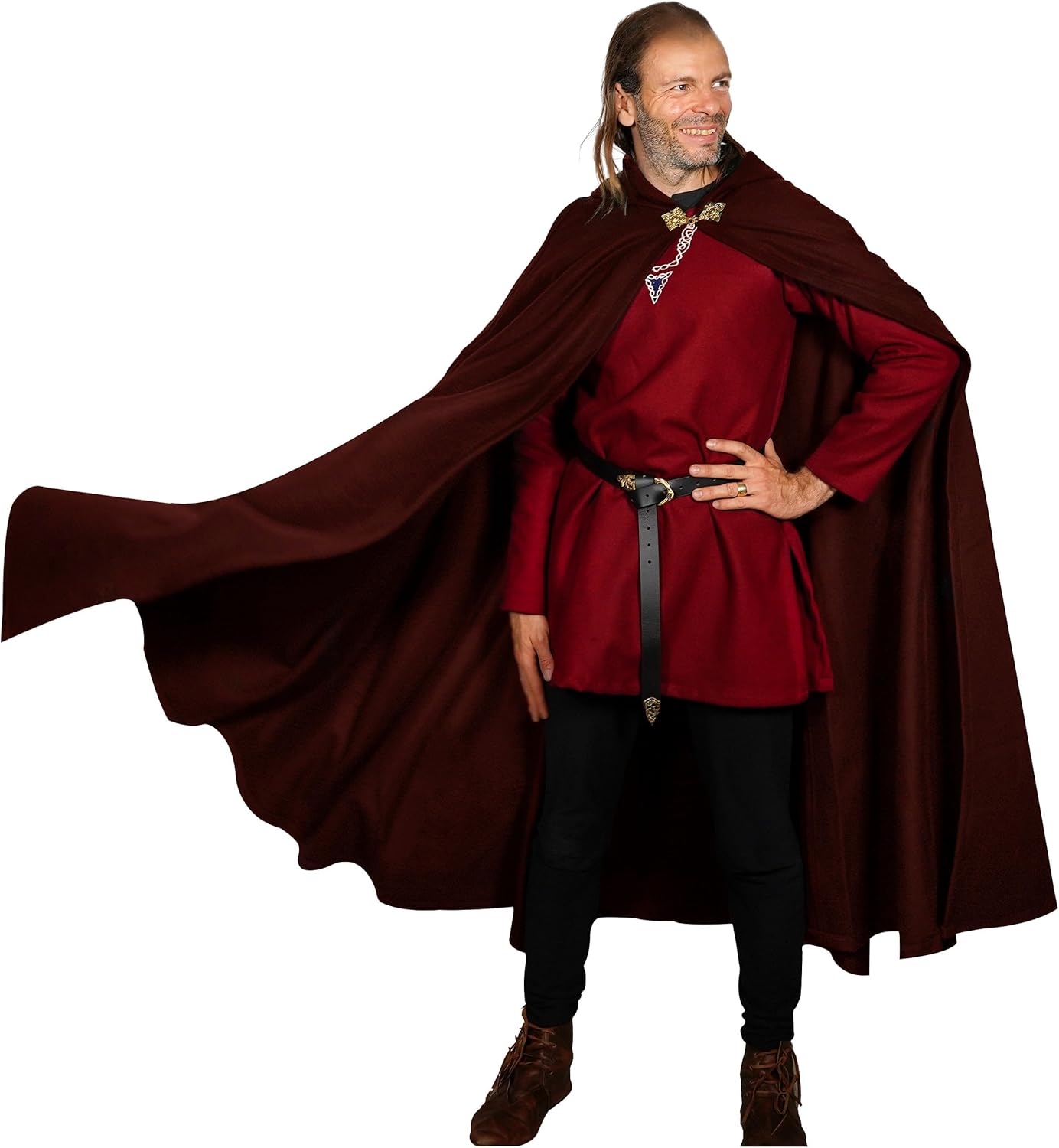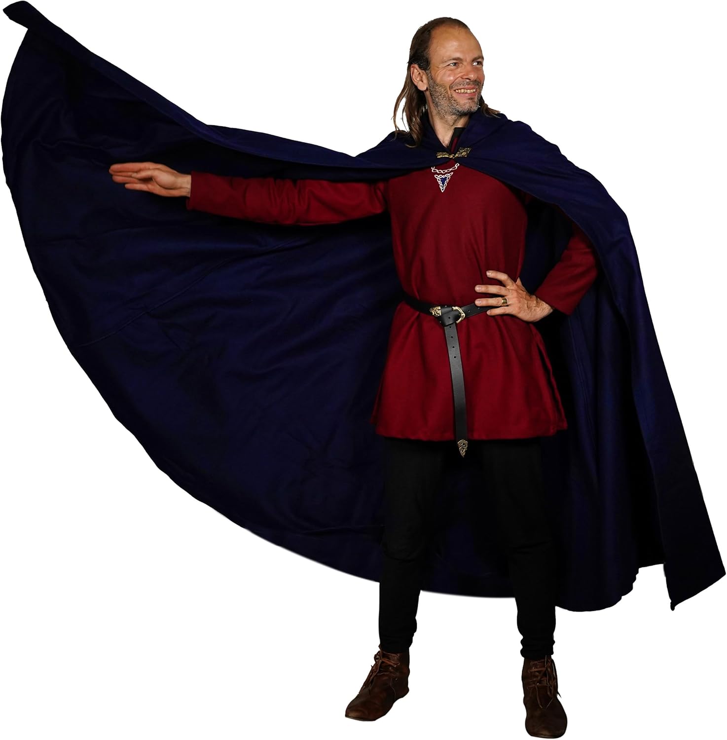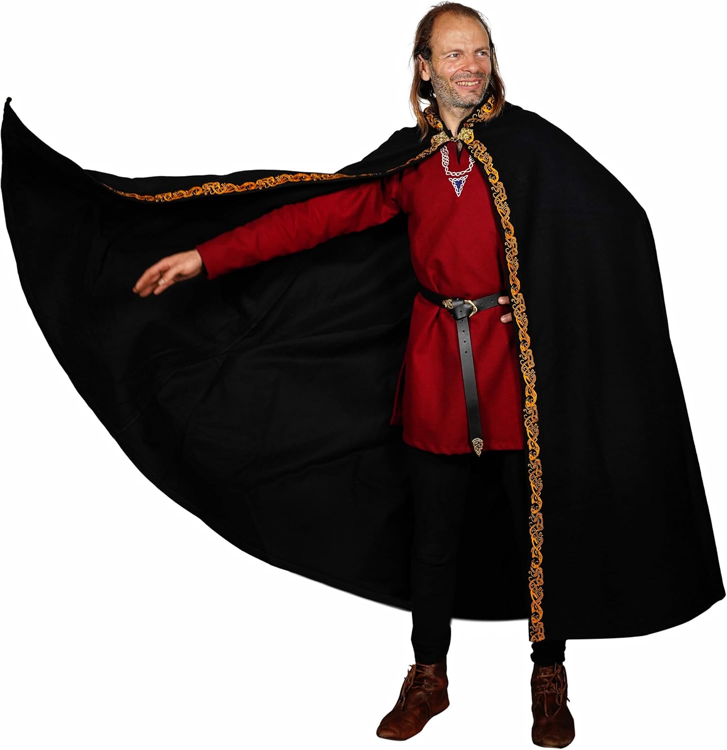 Mythrojan Medieval Hooded Cape is a versatile and stylish addition to any fantasy wardrobe. Crafted from high-quality Renaissance cotton canvas, this cloak features a generous hood and an open-front design, making it perfect for a variety of uses. Ideal for Halloween costumes, it effortlessly transforms into a witch’s cape or a dramatic poncho for hobbit cosplay. Its classic black color and medieval design also make it an excellent choice for Renfair, Viking reenactments, or other medieval events. Whether you’re channeling your inner medieval character or seeking a timeless piece for your costume collection, this hooded cape offers both functionality and a touch of historic elegance.
