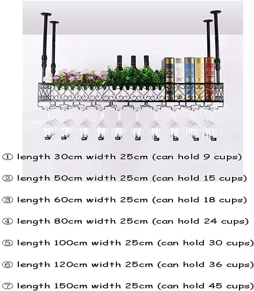 Specifications: Product Name: Hanging Wine Rack Product Material: Iron Product Color: Black, Bronze Product Technology: High Temperature Paint Product Size: Applicable Scene: Home, Kitchen, Bar, Restaurant, Clubhouse,Etc. Length 30, Width 25Cm, Height 30-60Cm (Adjustment), Can Hang 9 Goblets Length 50, Width 25Cm, Height 30-60Cm (Adjustment), Can Hang 15 Goblets Length 60, Width 25Cm, Height 30-60Cm (Adjustment), Can Hang 18 Goblets Length 80, Width 25Cm, Height 30-60Cm (Adjustment), Can Hang 24 Goblets Length 100, Width 25Cm, Height 30-60Cm (Adjustment), Can Hang 30 Goblets Length 120, Width 25Cm, Height 30-60Cm (Adjustment), Can Hang 36 Goblets Length 150, Width 25Cm, Height 30-60Cm (Adjustment), Can Hang 45 Goblets Product Package: 1 Wine Rack (Without Wine Bottle)