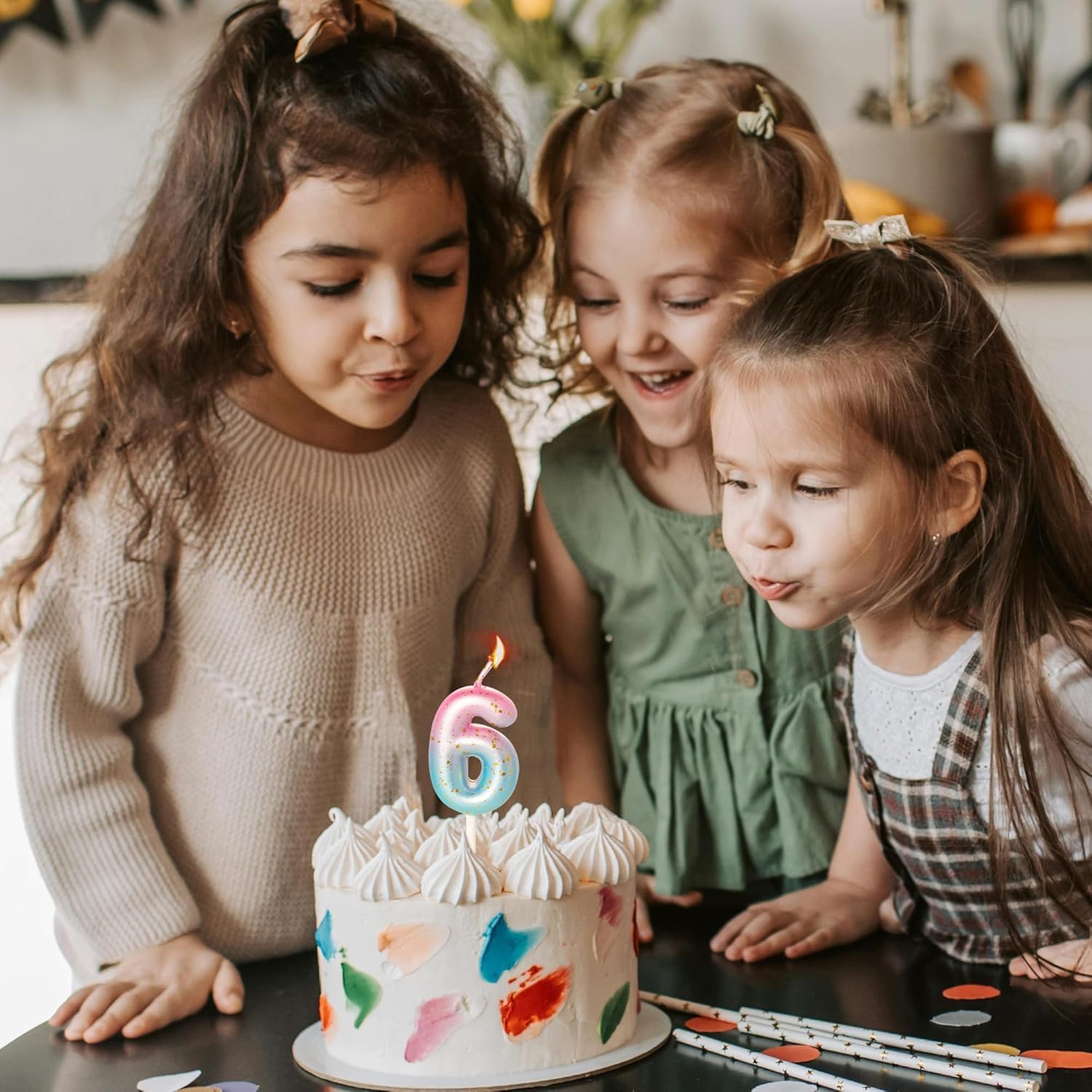 7pcs Pink and Blue Gradient Number Candles with Gold Glitter - Birthday Cake Candles (Number 5) for Girls, Women, Birthday Parties, Weddings and Anniversaries Directions: - Name: Number of Cake Candles - Colour: Shades from pink to blue - Material: paraffin, plastic. - Size: as shown Somatic Traits: 1. Includes a numeral candle and 6 slim birthday candles. 2. Made of high quality paraffin material, smokeless and portable. 3. Decorated with a beautiful gradient pink and blue design and gold dots. 4. Versatile for various occasions such as birthdays, weddings, anniversaries, etc. FRIENDLY TIPS: 1. Please allow a little size error due to handmade. 2. Please do not leave the burning candle unattended. 3. Please keep candles out of reach of children. 4. Please do not light candles on or near flammable objects. 5. Please keep the candles away from fire when not in use and burn them only under adult supervision. PACKAGE INCLUDES: 1 x Number Candles 6 x candles. birthday slim Notice of Safety Please do not leave the burning candle unattended. Please keep candles out of reach of children. Please do not light candles on or near flammable objects. Please keep the candles away from fire when not in use and burn them only under adult supervision.
