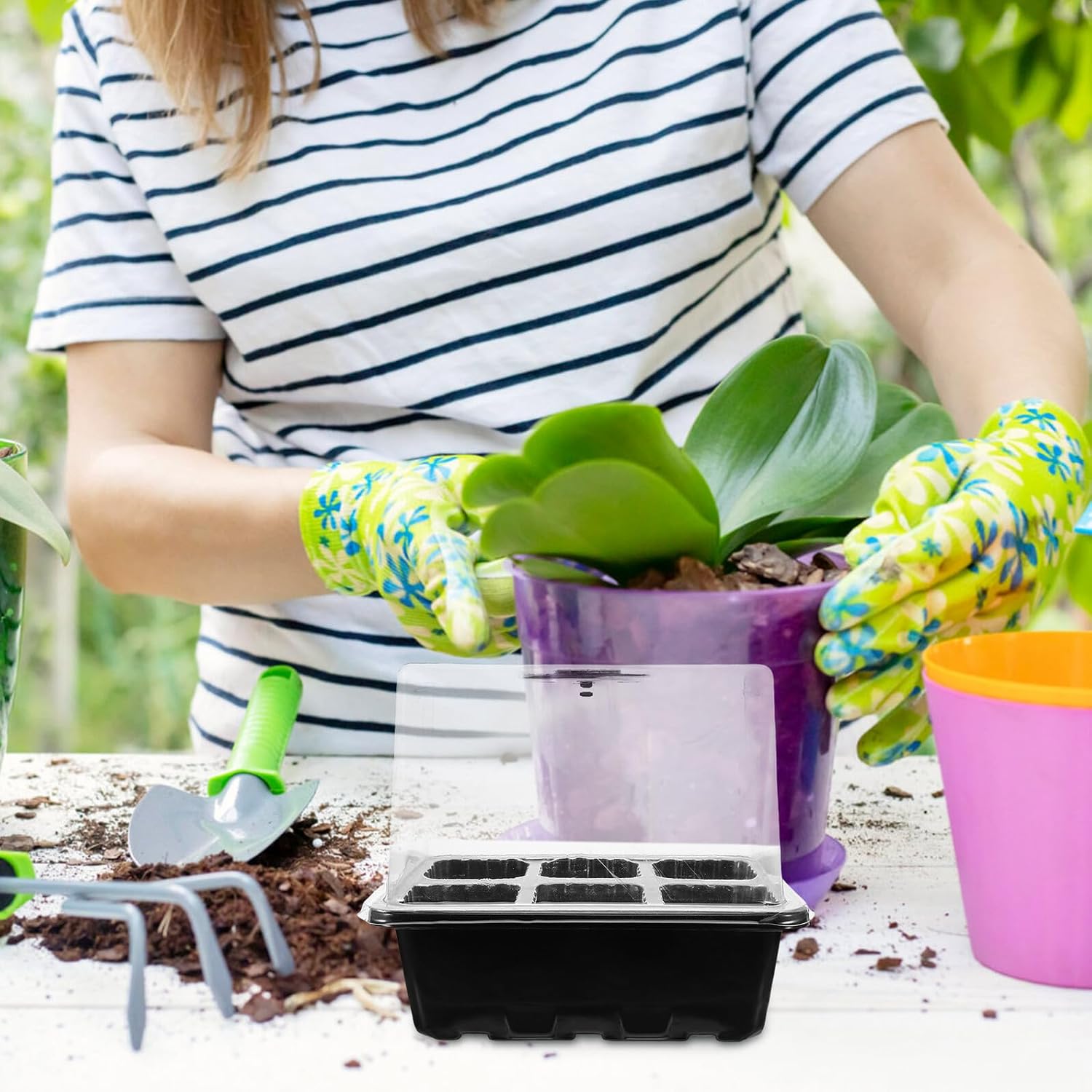Package Include 10 x Seedling Trays 10 Labels 2 Tools Features - Color: Black -Quick setup: the mini propagator kit comes with everything needed for planting, making it a practical greenhouse starter kit for gardening beginners and professionals alike indoor plants tray -Seedling Tray: made from durable plastic, the gardening supplies tray is reusable and safe, helping reduce waste while maintaining performance as a reliable seed starting tray gardening starter kit -Easy transplanting: stackable seed tray construction facilitates easy handling and moving seedlings from the plastic seedling tray to your outdoor vegetable bed or flower garden flower seeds tray -Healthy growth: the plant growing kit supports the entire seedling cycle, from seed propagation tray stage to full maturation, ensuring vigorous and healthy plant development portable propagation tray - Size: 18.50X13.50X11.00cm/7.27X5.31X4.32in -Product Info: Breathable seedling box -Material:Plastic -Efficient air circulation: the germination tray mesh design helps maintain adequate air flow, enhancing the quality of plant starter tray for indoor propagation kit setups plastic seed trayGoods Informationflower planting kit Whether you use it as a portable propagation tray or a DIY seed starter, its lightweight design fits balconies, rooftops, or small indoor gardens, fulfilling your indoor gardening kit needs.indoor gardening kit The plastic seedling tray features innovative aeration holes that promote healthy root development and increase the survival rate of greenhouse plants