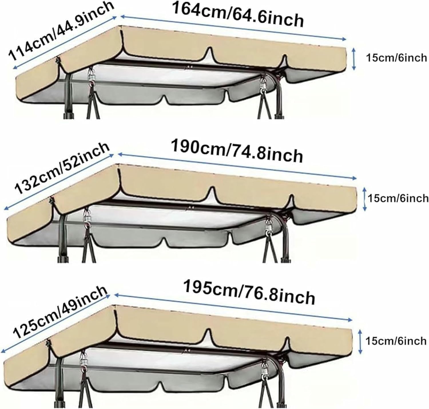 Patio Swing Canopy Replacement Top Cover, Replacement Cover for Swing Canopy, Garden Seater Sun Shade Treasures Porch Swing Hammock Protector Furniture Cover♛ Features:● Effective harmful Sun ray blocking & water repellent.● High-quality and durable 210D Oxford cloth.● Durable reinforced corners.● Additional graceful scalloped edge.♛ Specification:- Name: Replacement Canopy for Swing Seat and Swing Cushion Cover- Material: Waterproof 210D Oxford cloth.- Color: Black, Gray, Beige, Green, Red, Brown, Blue- Size:Chair cover: 150 * 50 * 10cm / 59.1 * 19.7 * 3.9 inch2-seater: 56x47x7inch/142x120x18cm3-seater: 65x45x6inch/164x114x15cm3-seater: 75x52x6inch/190x132x15cm3-seater: 77x49x6inch/195x125x15cm3-seater: 98x73x7inch/249x185x18cm♛ Packing list:1 x Replacement Canopy Top Cover1 x Swing Cushion Cover♛ Note :1.Due to manual measurement, please allow a difference of 1-3 cm.2.Due to different conditions of light and screen, the color of the product may be slightly different from the picture.