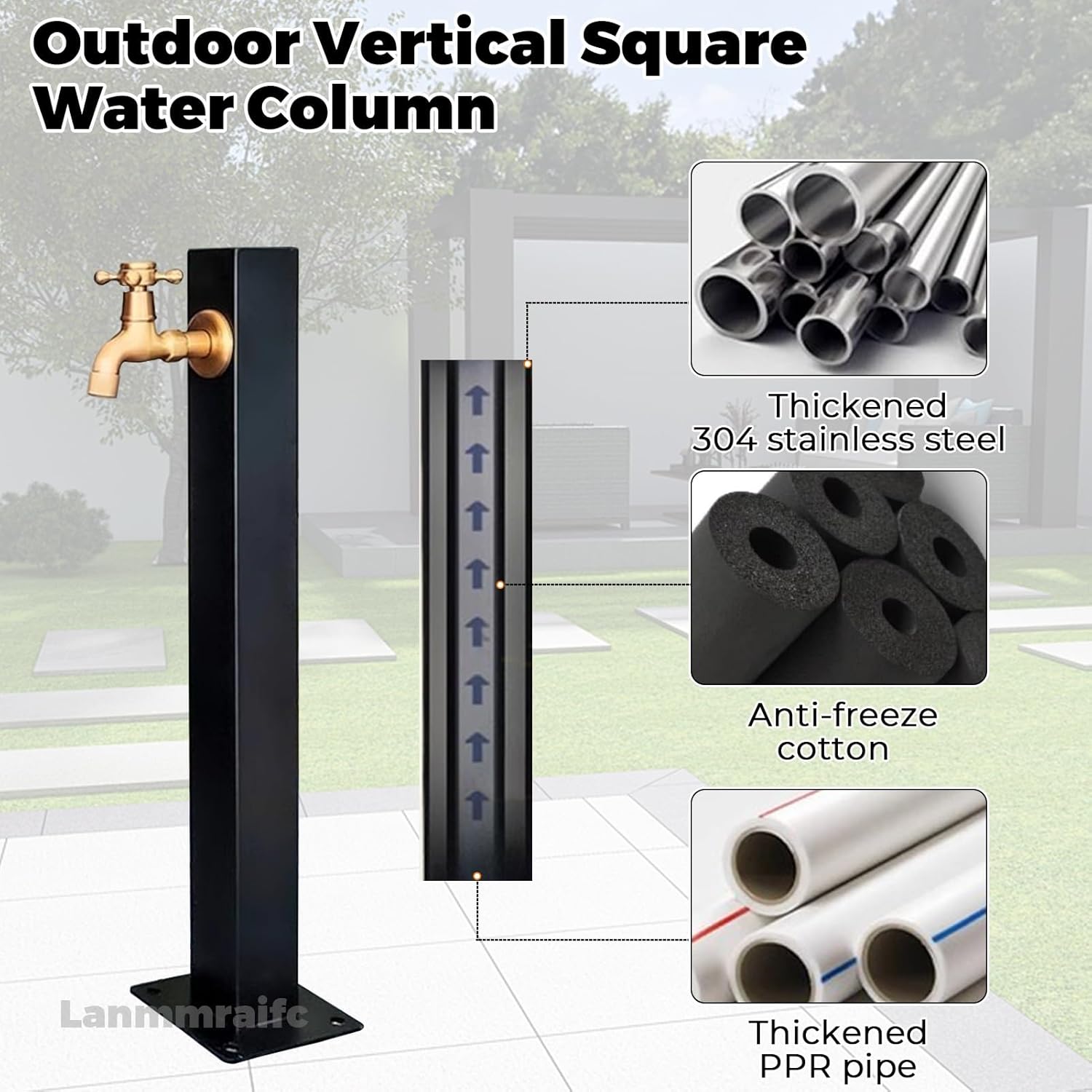 Blends perfectly with any garden decoration, making watering your garden or gardening a breeze. Product Specifications:- Product Name: Outdoor Vertical Water Column Faucet - Water Column Material: 304 stainless steel- Faucet Material: brass- Installation Method: side water inlet, bottom water inlet- Product Heights: 60cm/23.6in, 95cm/37.4in- Pipe Width: 6cm/2.4in- Color: Black Features:- The faucets are made of solid brass, durable and rustproof.- The internal of water column with anti-freeze thermal insulation layer, insulation and sun protection. Sun and rain proof in summer, anti-freeze and cold in winter.- Sturdy base holds the water column firmly to the ground without tilting. - There are two installation methods: side water inlet and bottom water inlet. - Easy to connect to the water source and can be used as a fire hydrant at any time. Package Includes:- 1x Water Column With Faucets- 1x Installation accessories After-sales service: We can customize any size/colour you want for you. You can tell us if you need it.