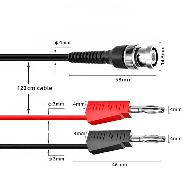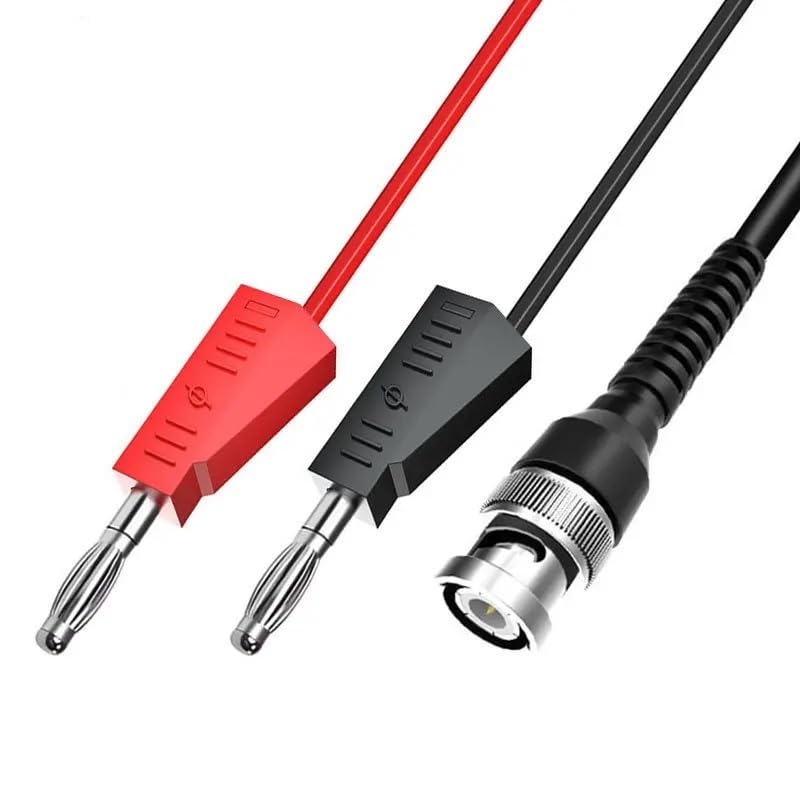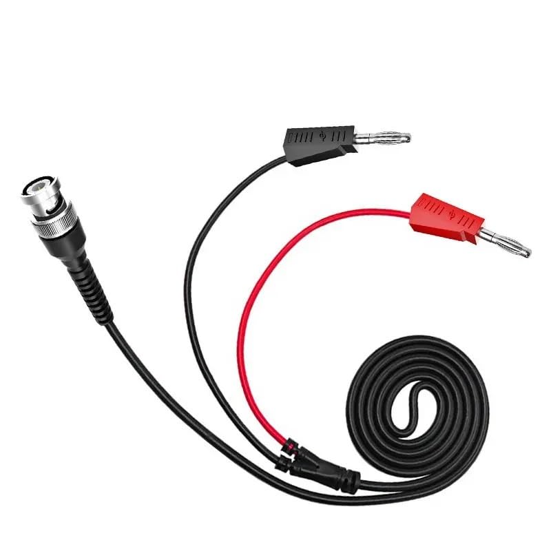 Oscilloscope ProbesP1009 BNC to 4mm Banana Plug Test Lead Dual Stackable Plug BNC Q9 Oscilloscope Probe Cable 120cm WireSpecification:Attenuation Coefficient: 1:1Cable outside Diameter: 4.0mmConductor outside Diameter: 3.0mmMax. Input Voltage: 500VpckCable Impedance: 50Test Leads Interface: BNCAlligator Clip Type: 4mm Stackable Banana PlugCable Length: About 100cmConductor Length: 20cmTotal Length: About 120cmPlug Overall Length: 44mmRelative Humidity: 85%Color: Black + RedPackage included:1 x BNC to Dual Stackable Banana Plug Test Leads