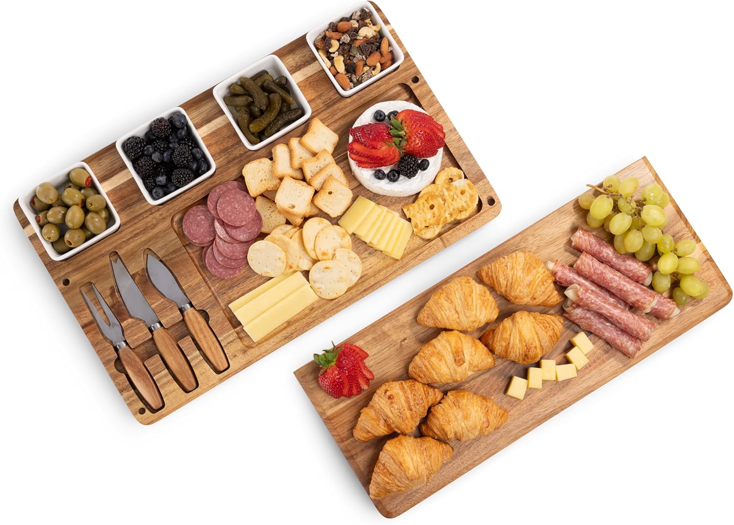The PICNIC TIME Picada Tapas & Cheeseboard Set is the perfect charcuterie board for any entertainer, designed to host your next sophisticated get-together. Crafted from durable Acacia Wood, this elegant serving platter includes four ceramic bowls for dips and sauces, making it ideal for tapas, cheeses, and snacks. The board features a removable top that provides extra serving space and cleverly conceals a hidden tool storage compartment underneath. Inside, you'll find a complete cheese board and knife set with three stainless steel cheese tools (fork, knife, and spreader). This versatile set brings both rustic elegance and smart convenience to your table.