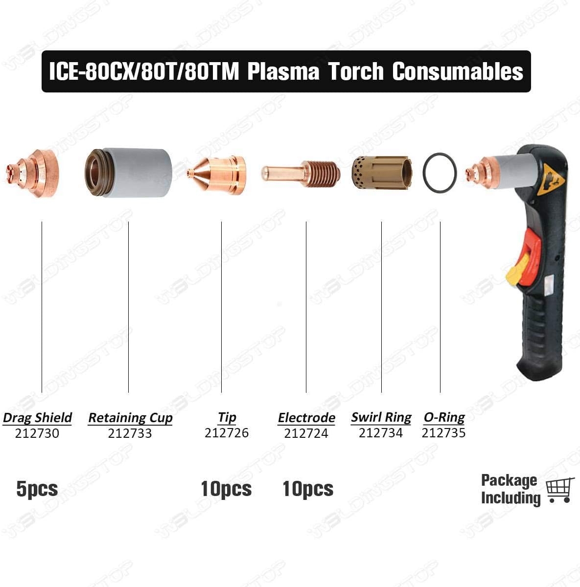 Specifactions Torch model:Fit Miller ICE-80CX Plasma Cutting Torch Reference Number: 212724 212726 212730 Item Package Quantity: 25 pieces Consumables type:Plasma Cutting Electrode Nozzle Shield Cap List Included Plasma Torch Electrode Ref: 212724 WSP-20004 10pcs Plasma Tip Nozzle Ref: 212726 WSP-20006 10pcs Plasma Shield Cap ef: 212730 WSP-20007 5pcs Instruction for use PKG/25 Plasma Cutting Tip Nozzle Electrode Shield Cap Fit Miller ICE-80CX Torch Attention: This product is not original Please Make Sure if the REF code matches If you are uncertain about compatibility of parts please contact us first