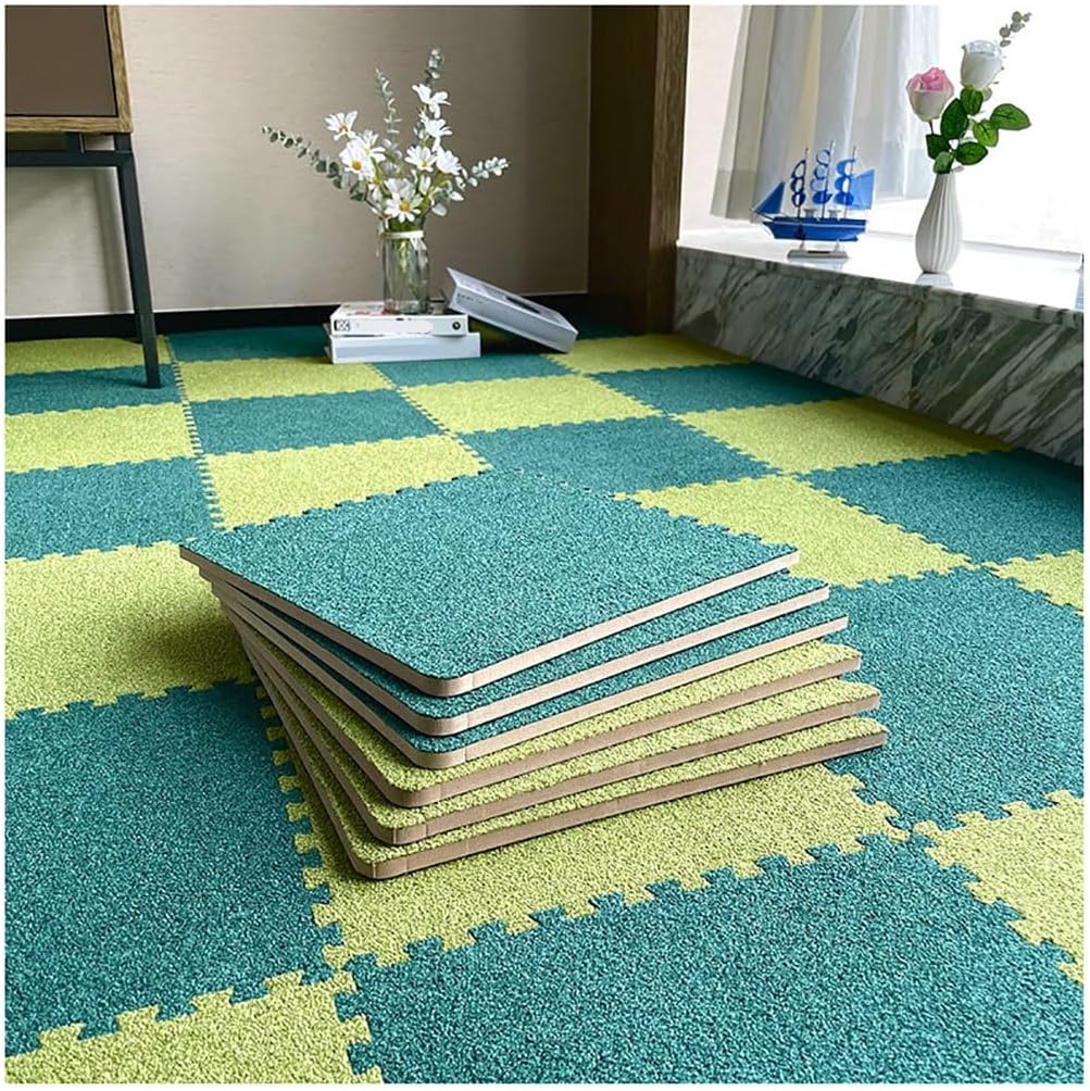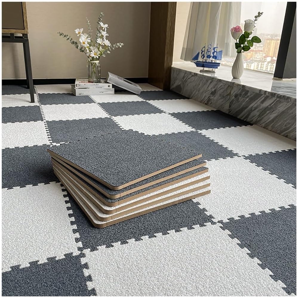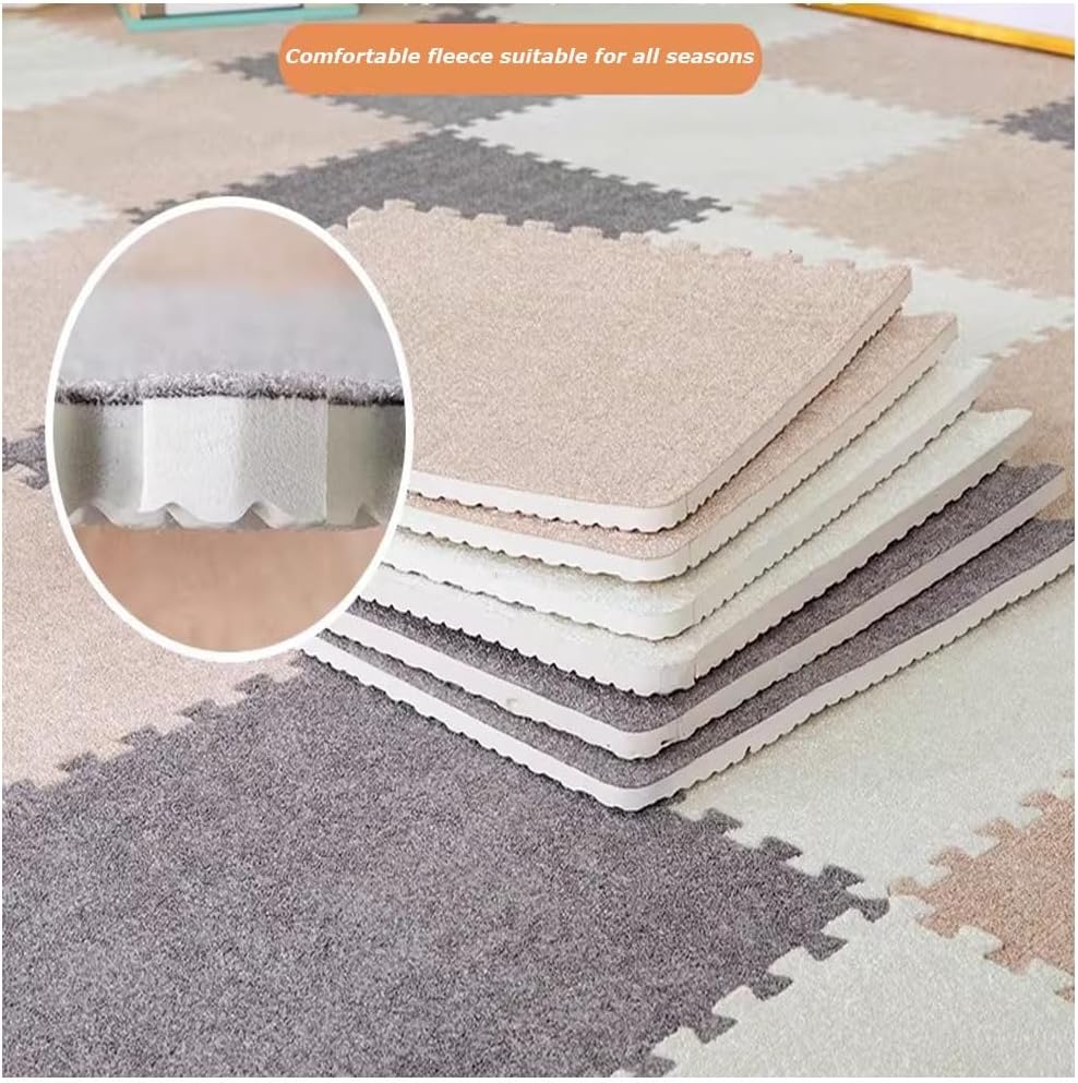 This plush patchwork floor mat provide superb floor protection, and make any space of your house prettier, safer; Perfect for home, utility rooms, bedrooms, gym, exercise, yoga or the garden etc. Also can be used to decorate your home room and many other occasions to add a pop of color to them.Product Name: Four Seasons Interlocking Floor MatMaterial: PE + plush materialSingle piece size: 30x30x0.6(cm)Product quantity: 10/20/30/40pcsColor:Dark gray+light brown , Dark green+grass green , Dark brown+light brown , Dark gray+white , Light brown+white , Light gray+white , Dark gray+light gray , Dark green+white , Light blue+whiteStyle: Simple and modernproduct advantages:1. The laying is simple and smooth, and the surface has specific anti-slip properties2. Soundproof, waterproof, heat preservation;3. Short plush design product thickness prevents from falling when playing on it, and it can also be used as a gymnastics mat indoors, which is convenient for storage.Instructions:1. After assembling according to the tooth and tooth, you can make any creative combination (there are tooth openings on the 4 sides for connection. The laying is simple and smooth)2. Before use, please unpack the package and place it in a ventilated place for a while to fully dissipate the residual faint smell.3. If you need to clean, please wipe with a wet towel, vacuum cleaner, and wash with waterNotes:1.The dimensions are measured manually and may have an error of 2-3cm. Please refer to the actual product.2.Product images may differ slightly in color from the actual product due to lighting conditions during photography,The actual product shall prevail.