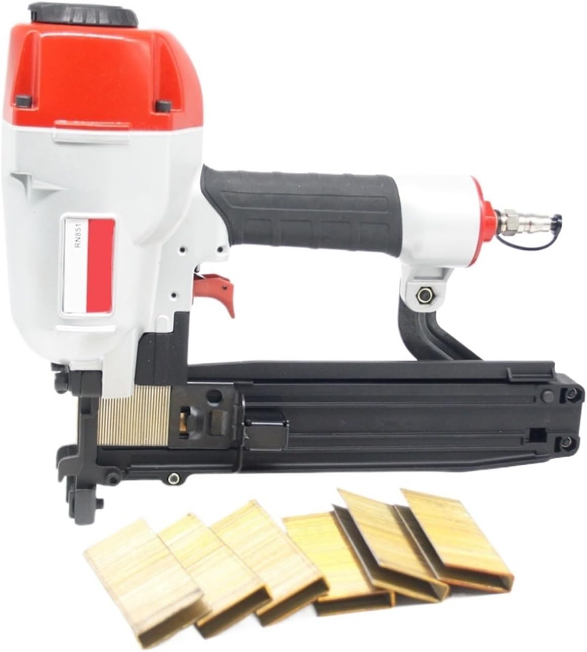 1. Equipped with a safety touch switch for rapid continuous firing, ensuring efficient and seamless without jamming, making nail driving quick and hassle .2. Streamline body design, Simple color design,nice-looking and pleasing to the eye ,Lightweight and portable, flexible and convenient,It also fit for operating in small space.3. Upper exhaust cover made of cast iron, Applicable to knocking at nails directly,Special striker design, stable and reliable qualitySpecifications:Model Number : RN851Dimension : 298mm x 349mm x 94Operating Pressure : 70-120 psi (5-8kg/cm2)Staple Capacity : 160 StaplesAir Inlet : 1/4" NPTStaples Gauge : 16GAStaples Crown: 7/16" 12.25mmStaples Length : 25mm-50mmStaples Width : 1.4mmThickness : 1.57mmpacking list :1pcs Pneumatic Stapler