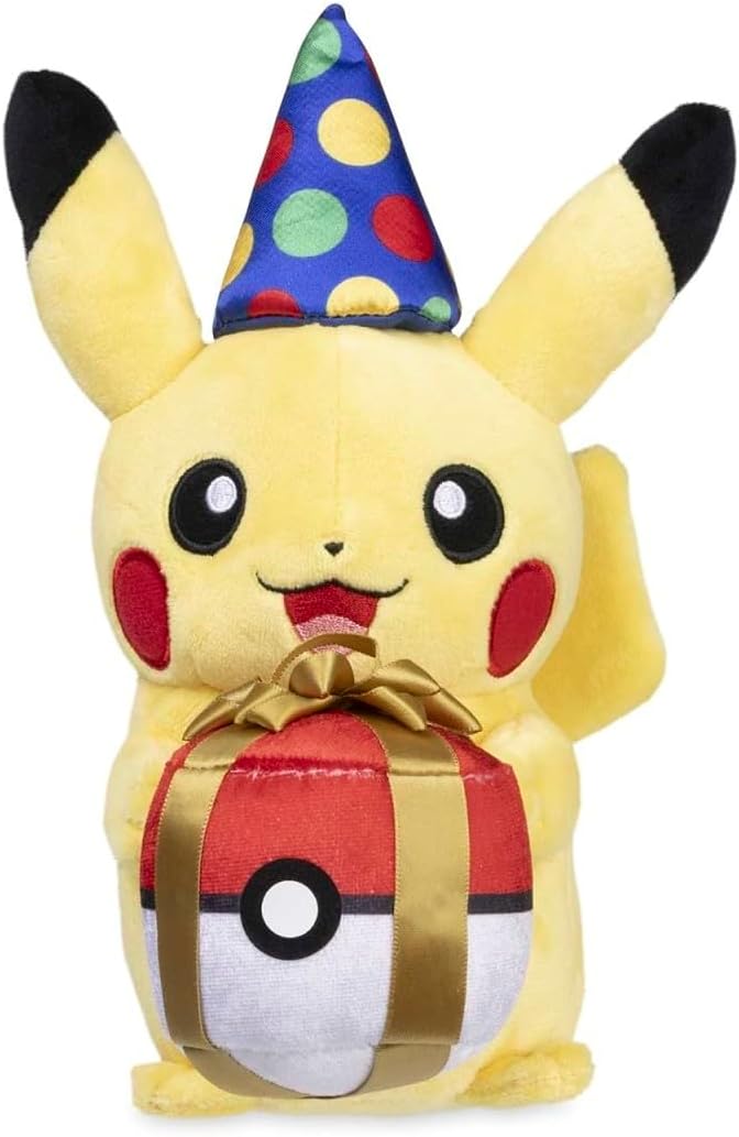 With a colorful hat and shimmery present, Pikachu's all dressed up and ready to celebrate someone's birthday! Whether you gift this fun plush to a friend or display it as a centerpiece to celebrate your own special day, it's an easy way to spread the joy of Pokémon.Makes a great giftPikachu looks ready to open a present of its own!Part of the Poké Plush collectionPokémon Center OriginalItem Dimensions: 7 x 5.3 x 9 inches (17.7 x 13.4 x 22.8 cm)Materials: All new material / polyester fiber / polypropylene / polyurethane foamCare Instructions: Surface Wash OnlyRecommended Age: 4+ YearsItem Weight: 3.3 OZ