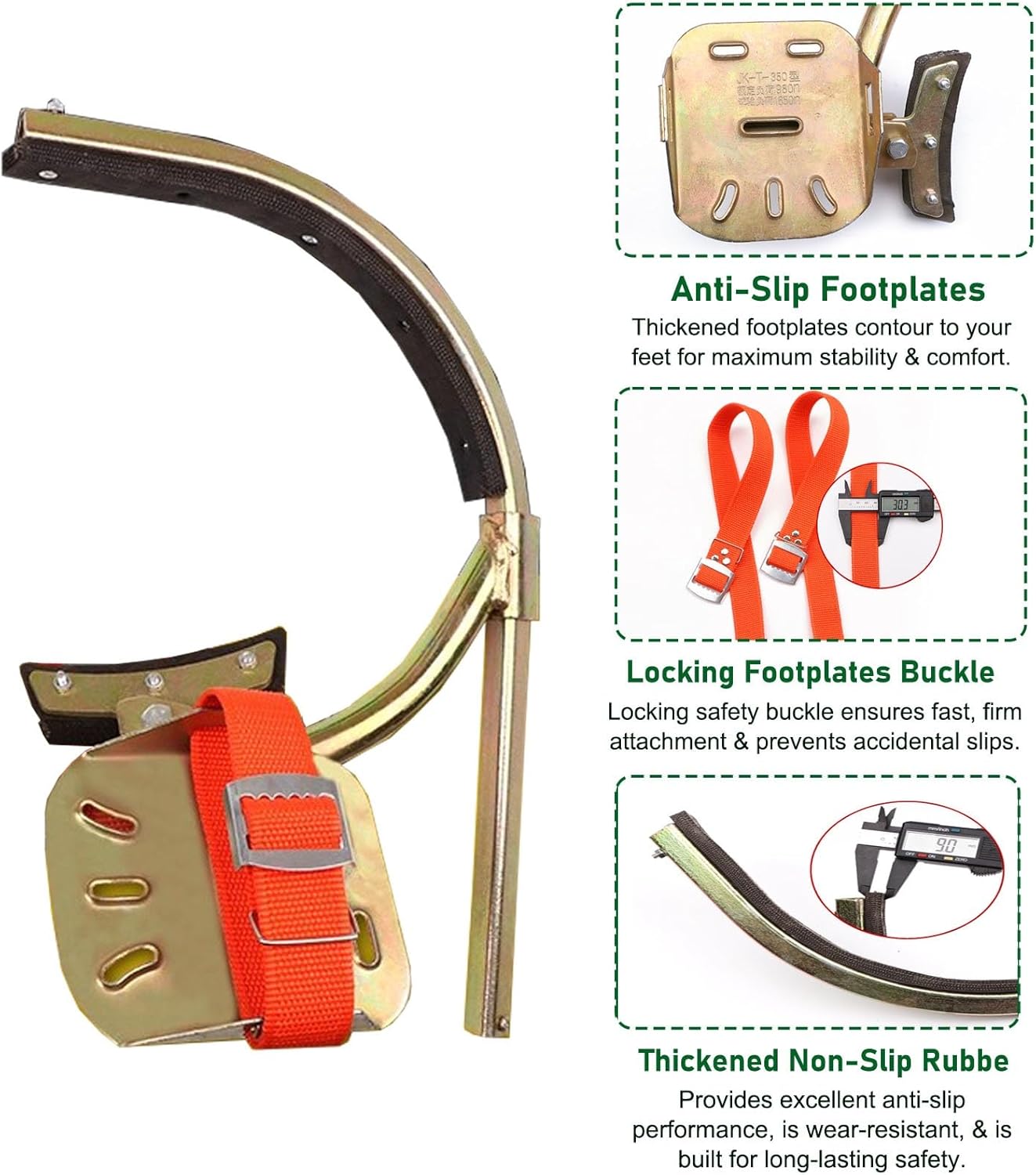 Experience unparalleled safe and efficiency with our premium lineman climbing spurs, expertly designed to provide maximum grip and deble fall protect. Perfect for professals working at heights, these spurs ere you stay secure while tackling various climbing ta. **Specificats:** - **Material:** Steel for long-lasting performance - **Load Capaci:** 150 kg (330 lbs), accommodating various users - **Model Opts:** - **Model 250:** Opening diameter 15-25cm (5 7/8"-9 7/8"), suitable for poles 6-8m (19.7-26.2ft) - **Model 300:** Opening diameter 16-30cm (6 1/4"-11 3/4"), suitable for poles 8-10m (26.2-32.8ft) - **Model 350:** Opening diameter 19-35cm (7 1/2"-13 3/4"), suitable for poles 10-12m (32.8-39.4ft) - **Model 400:** Opening diameter 20-40cm (7 7/8"-15 3/4"), suitable for poles 12-15m (39.4-49.2ft) - **Model 450:** Opening diameter 22-45cm (8 5/8"-17 3/4"), suitable for poles 15-18m (49.2-59ft) - **Model 500:** Opening diameter 24-50cm (9 1/2"-19 5/8"), suitable for poles 18-21m (59-68.9ft) - **Model 550:** Opening diameter 26-55cm (10 1/4"-21 5/8"), suitable for poles 21-2 (68.9-75.5ft) - **Model 600:** Opening diameter 28-60cm (11"-23 5/8"), suitable for poles up to 27m (88.6ft) **Features:** - Versatile design accommodates a ran of pole sizes - High-visibili enhances safe in low-light condits - Reced 30mm harness eres a secure and comfortable fit - Cact and lightweight for effortless transport - Thicker rubber pads provide ior grip and wear resi **Packa Includes:** - 1 x Pole Climbing Spurs - 1 x Safe Belt - 1 x Foot Strap **Usa Tips:** - Always secure the waist and foot belts before use. Beginners are advised to practice at lower heights initially. - Allow for slight urement variats due to manual uring. - Colors may vary slightly due to different lighting and sn . **Customer Support:** We are committed to your satisfact. If you have...