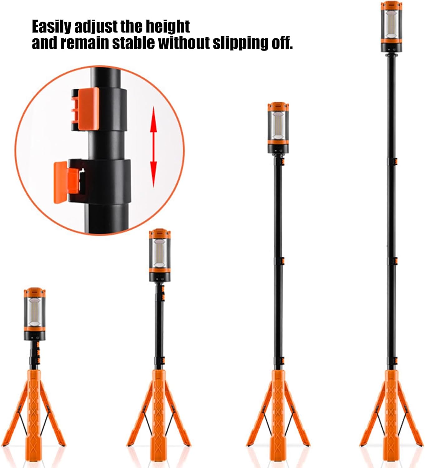 Portable Telescopic Camping Lamp With USB Power Banks Function And 180 Degree RotationFeatures:This rechargeable camping light features five versatile lighting modes—warm light (3500K), warm white (4500K), white (6500K), spotlights (8300K), and —each with three adjustable brightness levels for flexible outdoor illuminations.Equipped with a built in high capacity battery offering USB output and Type C input as a power banks, and a detachable telescoping tripod extending from 30 to 70 inches with base, slip pads, and hooks for stable positioning.Designed for outdoor enthusiasts, campers, construction workers, and responders needing , adjustable light for tasks in challenging environments.Ideal for scenarios like camping, hiking, construction sites, repairs, and outdoor gatherings, providing illuminations in uneven terrains and various conditions.With its IPX4 rating, ABS construction, and 180° vertical/270° horizontal adjustable LED heads, this portable work light ensures precise, multi angles lighting for both focused and wide area coverage.Specifications:Materials:ABSProduct size: 75-186CM after installation, lamp head 21x9CM, lamp head 21x9CMModes: Warm (3500K), Warm White (4500K), White (6500K), spotlights (8300K) and Brightness levels: 3 levelsPackage Includes:Lamp holderx1Tripodx1Note:Pay attention to the storage methods.