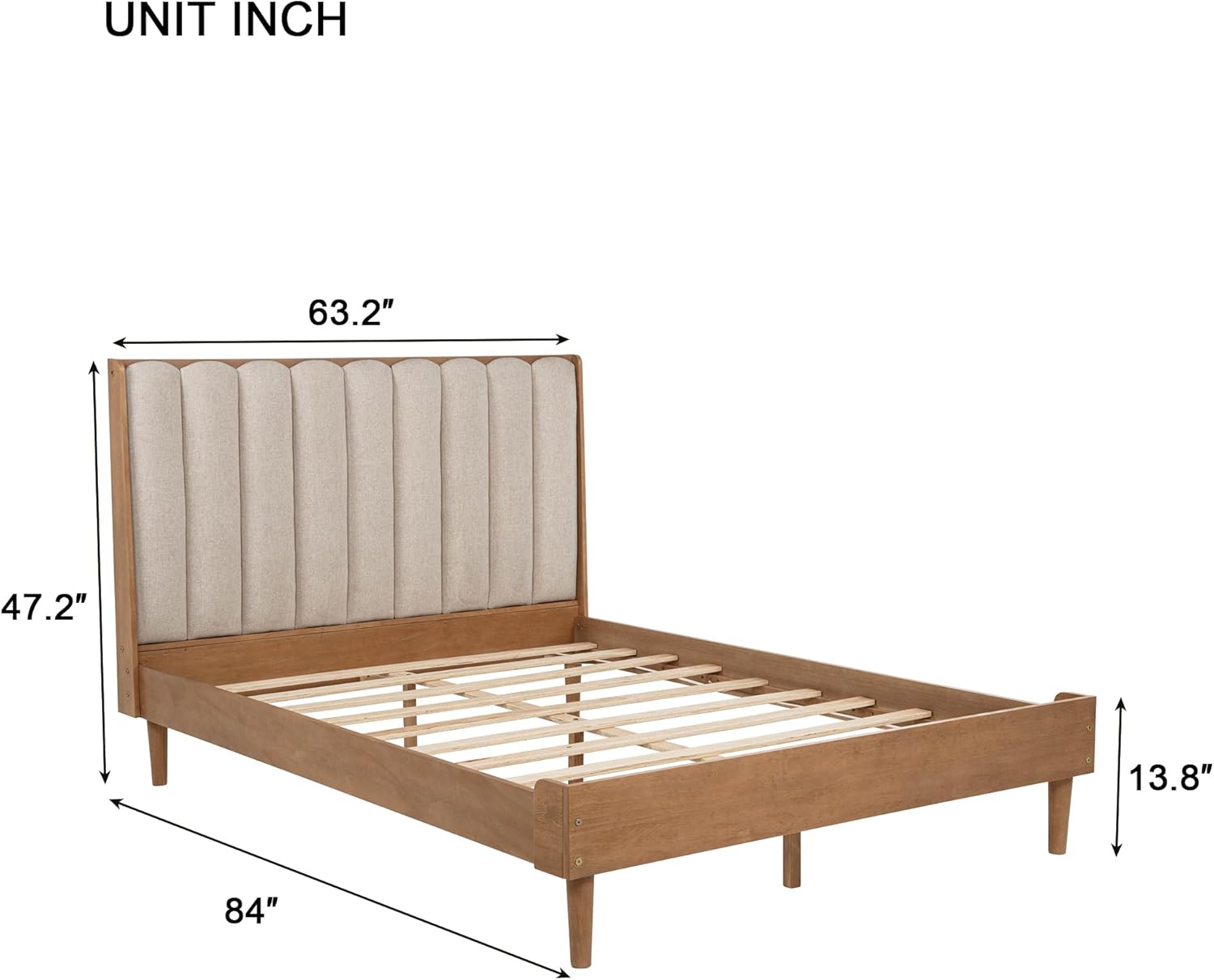 Queen Size Wood Bed with Piano Key Style Upholstered Headboard, Wood Bed with Strengthened Bed Frame: The queen-sized bed, distinguished by its minimalist and modern design, substantially elevates the aesthetic value of your bedroom through its exquisitely crafted upholstered headboard. Its engineered structure maximizes spatial utilization and coziness, facilitating the harmonious incorporation of supplementary furnishings and decorative elements. Weight & Dimensions: Overall Product Dimension: 84.00"L x 63.20"W x 47.20"H Product Weight: 99.20 LBS Detail Product Dimension: Please refer to the Size image Number of Package: 2 Package 1 Dimension: 39.4 x 22.8 x 7.9 In. 33.1 LBS Package 2 Dimension: 83.1 x 13.4 x 5.9 In. 75 LBS Overall Weight Capacity: 400 LBS Recommended Mattress Thickness: 6-10 inch Specifications: Product Type: Platform Bed with Headboard Size: Queen Color: Wheat Shape: Rectangular Bed frame: Pine wood,Plywood,MDF Bed legs: Rubber wood Headboard: Foam,Polyester Number of Slats: 10 Pcs Box Spring Required: No Mattress Included: No Assembly Required: Yes Manual and Hardware: Yes Country of Origin: Vietnam Notes: -Manual measurement has been used, there may be some reasonable error. -All the pictures are taken by actual samples, slight chromatic aberration may occur due to lighting or display.