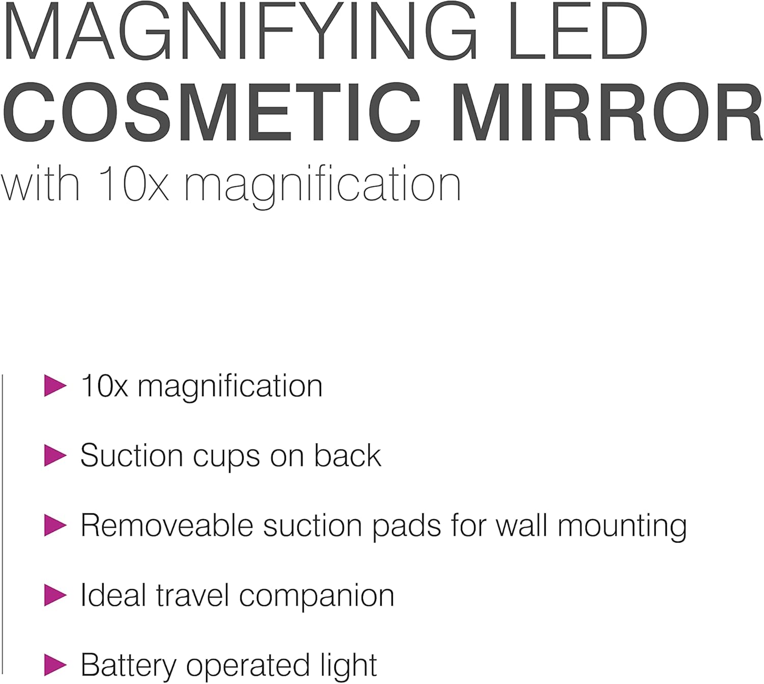 Product Description See things more clearly with the Rio 10 X Magnification Mirror. The 10 X Magnifying Mirror has to be experienced. It is compact , has optional suction pads for attachment to any other mirror or smooth surface and a built in battery operated light for a clearer view letting you insert contact lenses , apply make-up and tweeze with ease! Set Contains: 1 x 10 X Magnifying Mirror