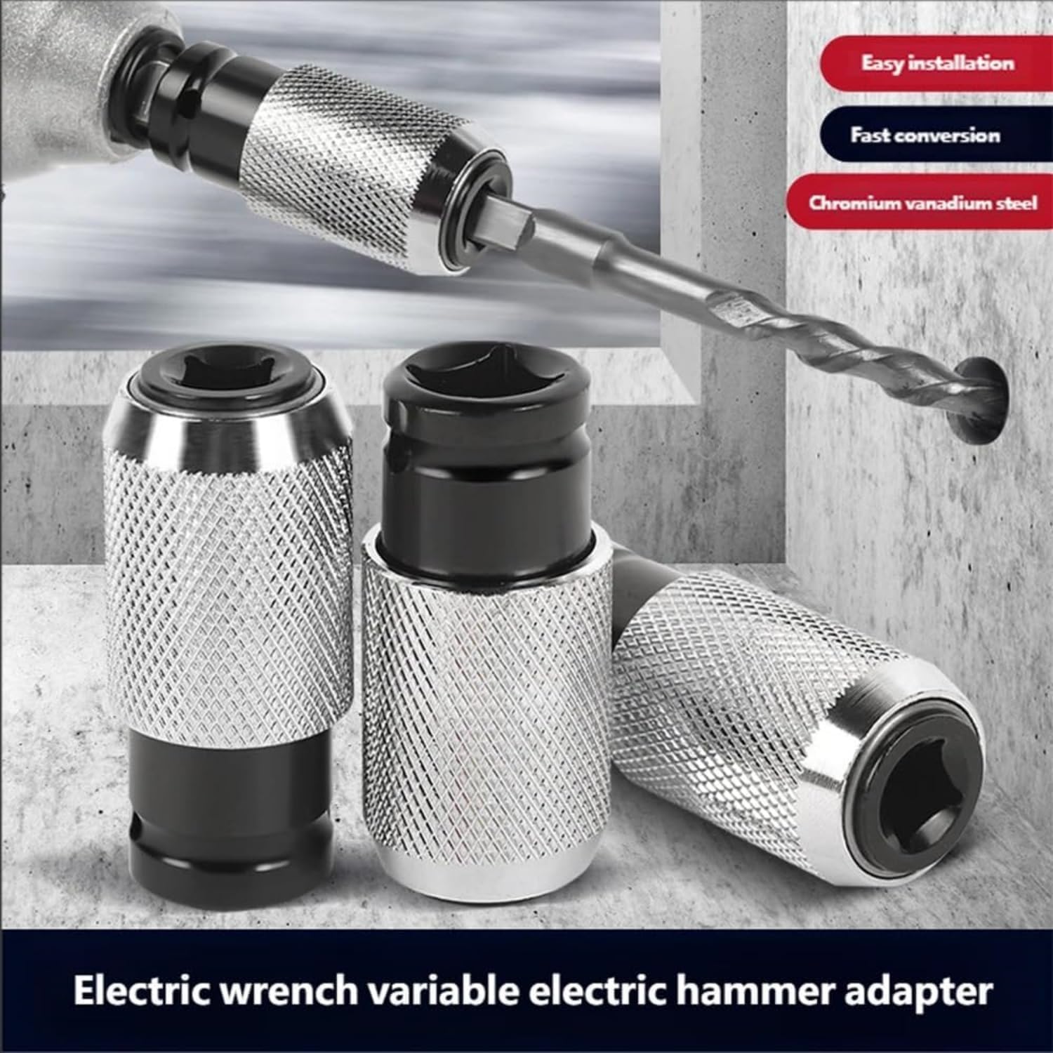 Specifications:Product Name: Rotary Hammer Adapter with Impact Drill Bits Set: Crafted from durable chrome vanadium steel for enhanced longevity and performanceProduct Size: Approximately 6.3x2.8cm/2.48x. , compact and easy to handleDrill Bit Sizes: 0.6cm (0.24in) for precision drilling in various materials0.8cm (0.32in) for general-purpose tasks.0cm (0.39in) suitable for heavier applications.2cm (0.47in) designed for more demanding drilling needsInterface: Standard square-shank four-slot design ensures compatibility with most electric wrenches and hammer drillsWeight: Lightweight at about 200g, ing it easy to maneuver during usePacking List:Includes or 2 pieces of Electric Wrench to Hammer Adapter, providing versatility for various projectste:. Please be aware that the item color may vary slightly due to different lighting and screen settings.2. Manual measurements may result in a size difference of -2cm.Elevate your DIY projects or professional tasks with this Rotary Hammer Adapter Set. Engineered to deliver reliable performance, it allows for effortless transitions between drilling tasks. Whether you're w on home renovations, automotive repairs, or construction, this set equips you with the essential tools to tackle a wide range of materials. Experience enhanced efficiency and precision with our thoughtfully designed drill bits, suitable for diverse applications. Ideal for both hobbyists and professionals, this set is a valuable addition to your toolkit, ensuring you are prepared for any challenge.