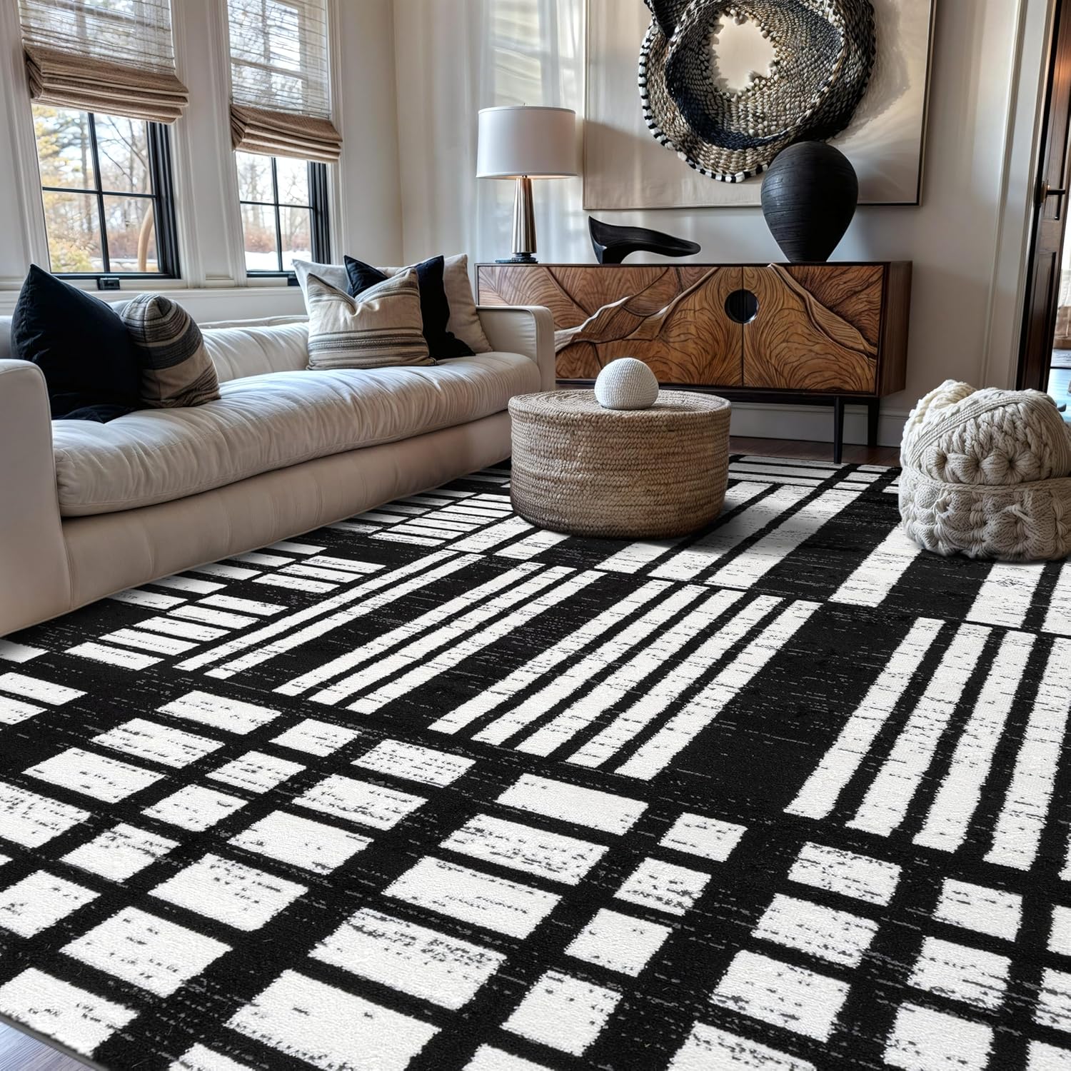 Upgrade your home with this bold black and ivory modern area rug, designed to deliver contemporary elegance and high-performance durability. Featuring an abstract grid pattern, this rug is made from stain-resistant polypropylene fibers — perfect for high-traffic areas like living rooms, bedrooms, or entryways. Its low-pile construction allows for easy vacuuming and smooth placement under furniture. Fade-resistant and built for long-lasting use, this rug combines stylish contrast with practical everyday functionality. Ideal for modern, minimalist, and industrial interiors.