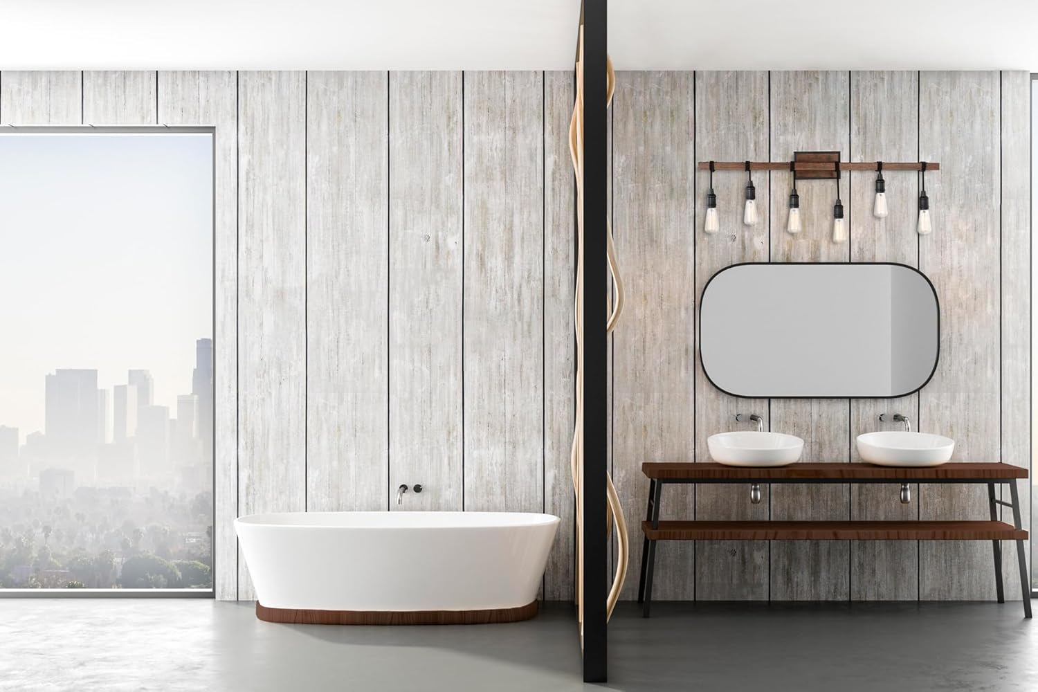 Simple, rustic style is yours with the unique Savoy House Burgess 6-light bath bar. It features little more than bare bulbs suspended from cords wrapped around the bar-shaped structure, finished in Durango, but this minimal look makes a big impact! Bath bar lights are a classic choice for illuminating vanity mirrors in bathrooms big and small, though this fixture could be used in other wall-mounted applications as well. Since the bulbs are exposed, try using stylized bulbs (not included) like tubular shape or Edison style for a different look! The Durango finish pairs nicely with black or bronze hardware, but also can mix with hardware in other finishes. Rustic, industrial and modern farmhouse style spaces are ideal choices for Burgess. When you choose a Savoy House lighting fixture, you can be certain you’ve selected a piece that will withstand the test of time.