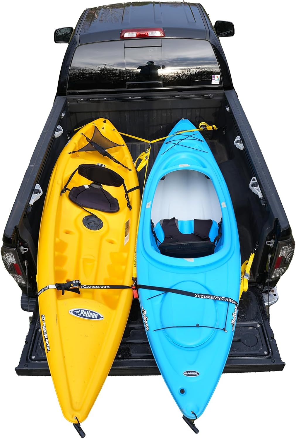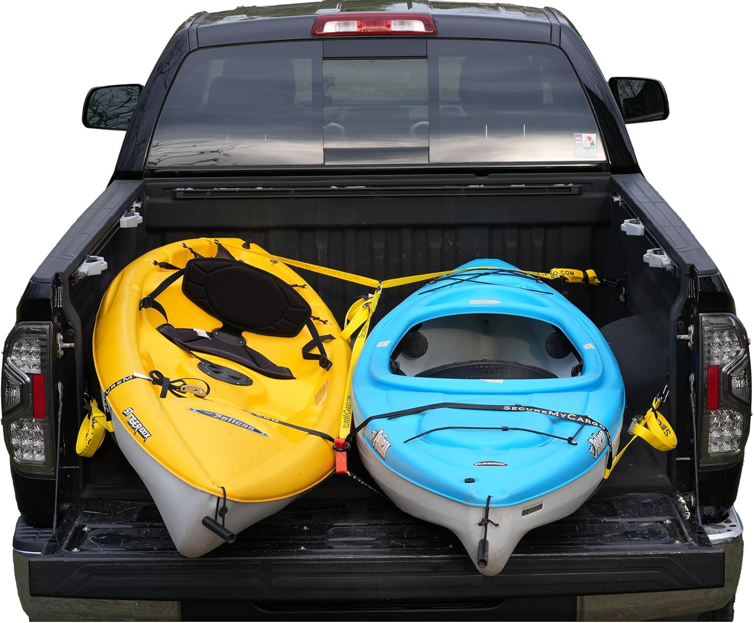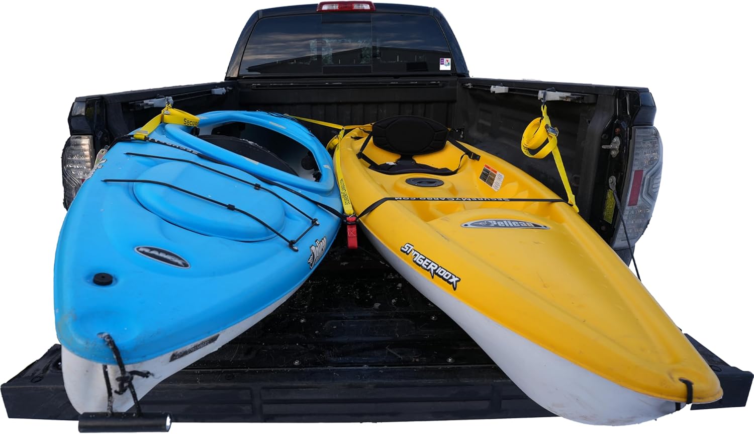 When you’re hauling two kayaks or SUPs, traditional straps get messy fast. The Dual‑Kayak Nose Strap System solves that problem with a wide, dual‑nose design that secures one or two watercraft at the same time. Load your boats, loop the strap over the noses, tighten the side straps, and you’re ready to roll — no ratchets, no knots, no chaos. Secure Your Two Kayaks with Ease: The Quick-Connect Truck Bed Tie-Down System provides a fast, reliable way to secure your watercraft in your pickup truck bed. Made in the USA from 100% polyester, this system features adjustable cam buckle straps and a simple loop design, ensuring a secure and convenient setup for worry-free hauling. Key Features: - Main loop is 120" to accommodate two watercraft, with 110" long side straps ending in Keeper S-Hooks. - Break strength of 1500 lbs ensures secure transport. WHAT'S INCLUDED: - One 120" nose strap with two side straps with 8' reach (for securing the front of the watercraft) - Two Cam straps with 8' reach to cover the opposite end of craft and link to the front strap.