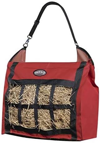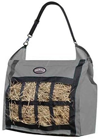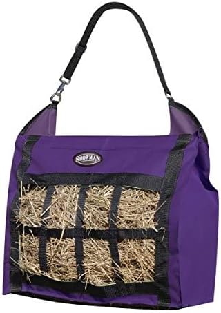 Showman Slow Feed Nylon Hay Tote. Durable heavy duty nylon hay tote is easy to fill and carry. Adjustable nylon strap with clasp. Large capacity opening with covered bars give added stability. Velcro closure and flip over velcro flap to keep hay secure. Small front squares allow small amounts of hay to be consumed at a time, helping digestion. Mesh bottom allows dust to fall through while keeping hay in the bag. Measures 21" x 6" x 23". Available Colors: Lime Green, Royal Blue, Black, Hot Pink, Red, Purple, Teal & Gray.