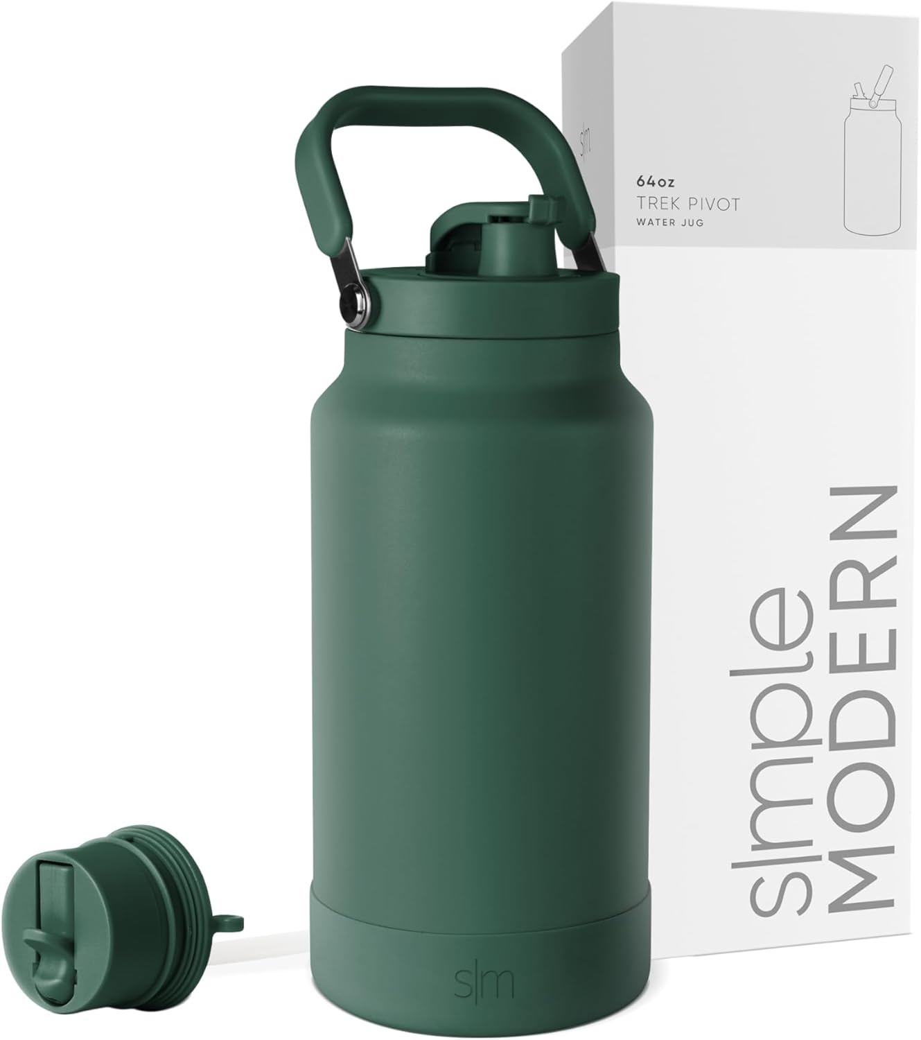 The Simple Modern Trek Pivot comes in a variety of trendy colors to showcase your personality and aesthetic while staying hydrated. Designed with everyday convenience and adaptability in mind, this jug features a multi-use lid design to customize your drinking experience. The Trek Pivot comes with a handle-lid and two interchangeable sipping pieces - straw and chug - so simply remove the lid from the tumbler, twist your desired sipping piece into the opening from underneath the lid, and start hydrating. A color-matched, silicone boot also comes with the Trek Pivot to help soften landings, enhance stability on surfaces, and help maintain its sleek appearance. This jug is made from 18/8 stainless steel to keep your drink cold or hot for hours, making it a perfect companion for those always on the go. Whether you're going on a road trip, playing sports, or embarking an outdoor adventure, this stylish jug is ready to support you.