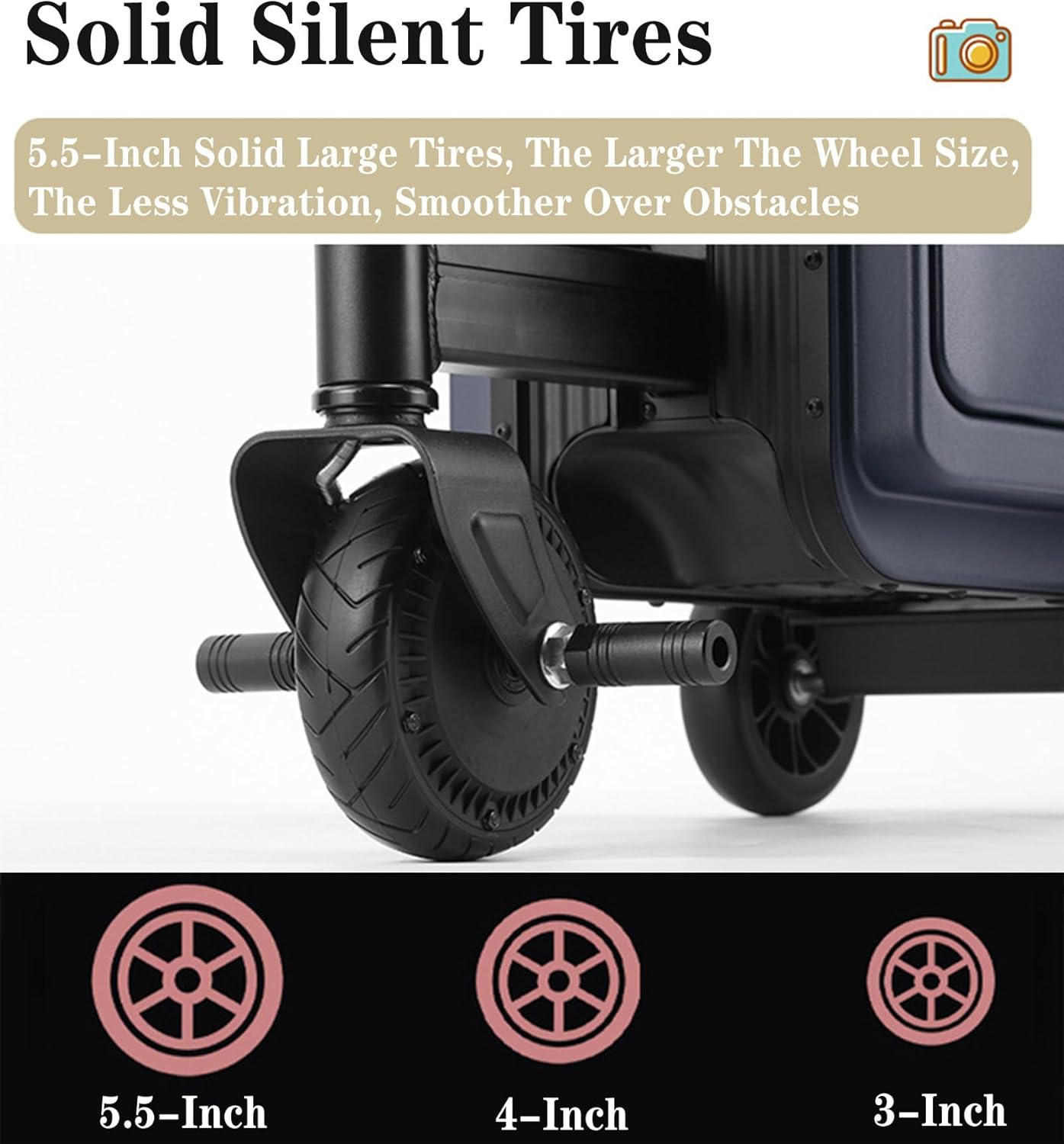 Features:1. Dual-Mode Design – Switch between ride-on and pull-behind modes instantly.2. Adjustable Handle – Telescoping design fits users of different heights.3. Airline-Compliant – 92.5Wh removable battery meets carry-on requirements.4. Smart Controls – One-touch telescopic and reverse function.5. Extended Range – Travel 8-12 km per charge (13 km/h max speed).Specifications:Product Name: Electric LuggageMaterial: Aluminum+ABS+PCBattery: 92.5WHMotor Power: 250WCapacity: 20LLock Type: TSA Coded LockControl: ManualLoad Capacity: 264LBs/120KGUSB Output Voltage: 5VCharging Time: 2HSpeed: 8 Mph/13Km/hClimbing Ability: 6° InclineWheels: 5.5" (Front)/5" (Rear) Solid TiresProduct Size: 19.6X21.6X8.6in/500X550X220mmWeight: 9.4KGPackage Includes :1 X Suitcase1 X Charging Cable1 X English Manual