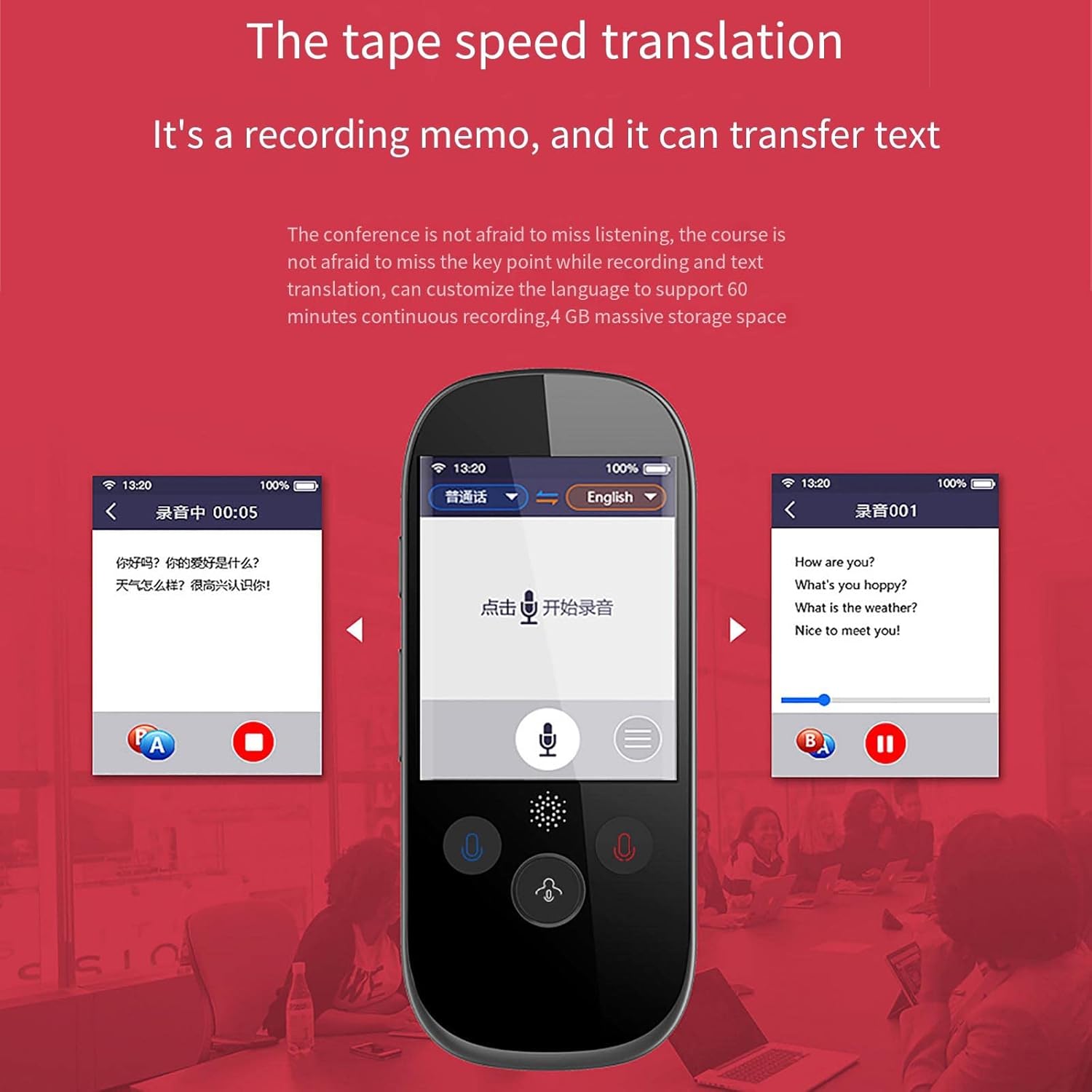 Have you ever visited a foreign country and wished you had a language translator with you? With , a two-way voice translator device, you can travel to countries around the world and communicate with confidence. This smart device continues to learn as you use it. Whether you're traveling through Asia or backpacking through Europe, language translator is your ultimate travel companion. Why Choose OUR Smart Language Translator Device? Online real-time translation in languages, serving you anytime, anywhere Achieves 98 percent accuracy Two-way Instant Translator Language Translator Device HANDHELD AND PORTABLE Language translator device size makes it the perfect travel companion. Our language translator device fits comfortably in the palm of your hand. Put it in your pocket, stick it in your purse. Its portability means you can take it whenever and wherever you go. Notice: 1. Due to the light and screen difference,the item's color may be slightly different from the pictures. 2. Please allow 1-3cm differences due to manual measurement. 3. 100% Satisfaction Guarantee: If you have any question about the product you received, please contact us without hesitation. We would try our best to help you and improve your purchasing experiences. Thank you for your kindly understanding.