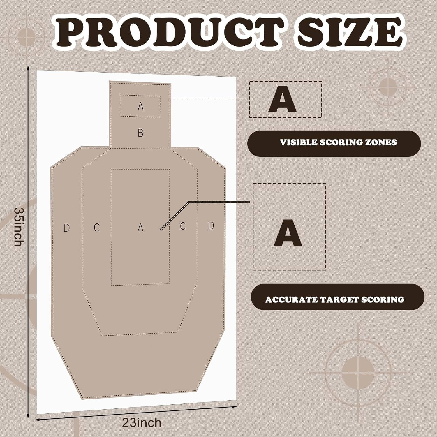 Features: The realistic full-size torso silhouette is designed specifically for shooting enthusiasts to simulate real-world scenarios and improve shooting accuracy under pressure. These gun targets are quick and easy to set up and mount easily to a target stand or rack. The convenient design allows for quick changes, saving time between shots. Specifications: Material: paper Color: as shown in the picture Size: 89 X 58.5 cm/35 X 23 inches Package includes: 100 X Shooting Paper Targets Notes: Manual measurement, please allow slight errors on size. The color may exist a slight difference due to different screen displays