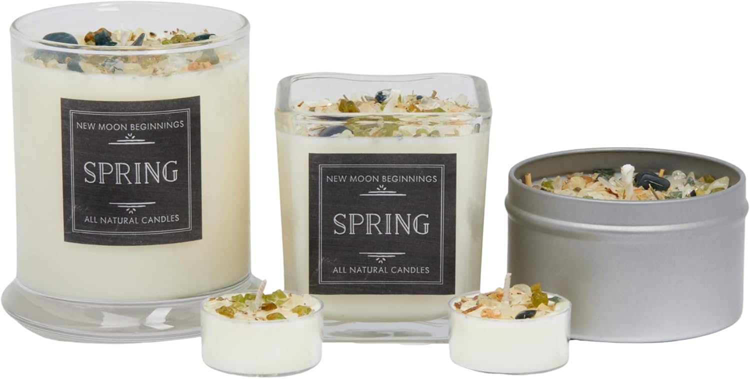 Our Spring Candle is a fresh and energetic scent which we created to promote Balance, New Beginnings, Action, and Abundance. Spring is a time to invite equilibrium and renewal into the mind, body, and spirit. It is a time when day and night are equal in length, and it is marks the shift from darkness and cold to warmth and light. It is a time of year to cultivate new ideas. It ushers in a renewed sense of energy brought in to help you focus and move forward in new, fresh, and positive ways. The Spring Candle has a Citrusy and Herbal scent with a wide variety of Healing Crystals on top, including Citrine, Peridot, Moss Agate, Lemon Quartz, and Clear Quartz.Size Options include: Tealights in a set of 6: Each Tealight is .75"" tall and 1.5"" in diameter7.5 oz. Glass Jar: 3 inches high and ~2.75 inches in diameter8 oz. Tin with lid: 2 inches high and ~3 inches in diameter12 oz. Glass Jar with lid: 3.5 inches high and ~3.25 inches in diameterBURN TIMES: Tealights: 4 to 6 hours per tealight7.5 oz: 20 to 30 hours8 oz: 20 to 30 hours12 oz: 40 to 60 hours
