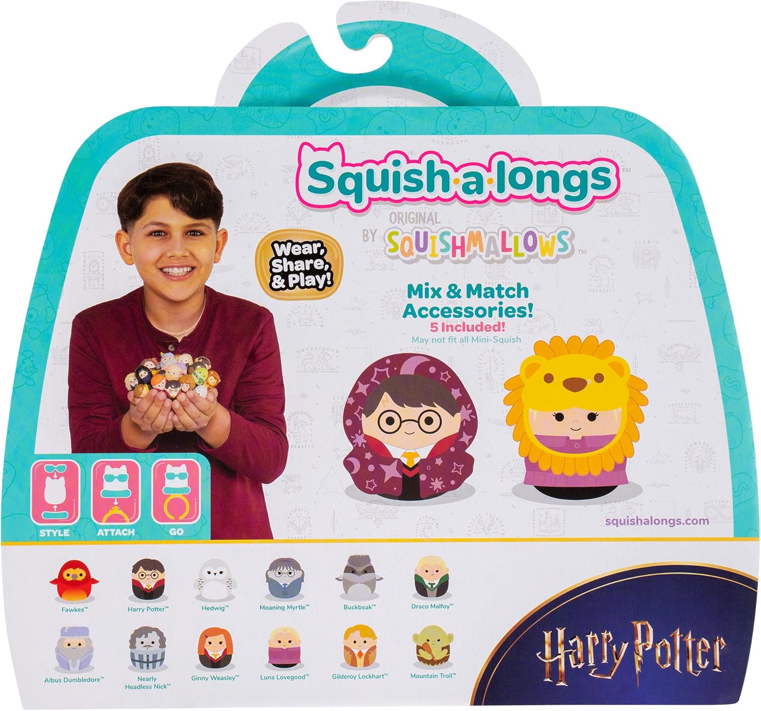 Cast a spell on your Squad with “Harry Potter” Squish-a-longs! This Squish-a-longs multipack includes 12 “Harry Potter” Mini-Squish—Harry Potter, Hedwig, Moaning Myrtle, Buckbeak, Draco Malfoy, Albus Dumbledore, Fawkes, Nearly Headless Nick, Ginny Weasley, Luna Lovegood, Gilderoy Lockhart, and Mountain Troll—in addition to Invisibility Cloak, Lion Head, School Bag, and Spectrespecs accessories for Mini-Squish styling. Play or display your “Harry Potter” Squish-a-longs at home, or attach your Mini-Squish to the included ring accessory to take the magic on the go! Only by Original Squishmallows and officially licensed by Warner Bros. Discovery. Join the Squad today!