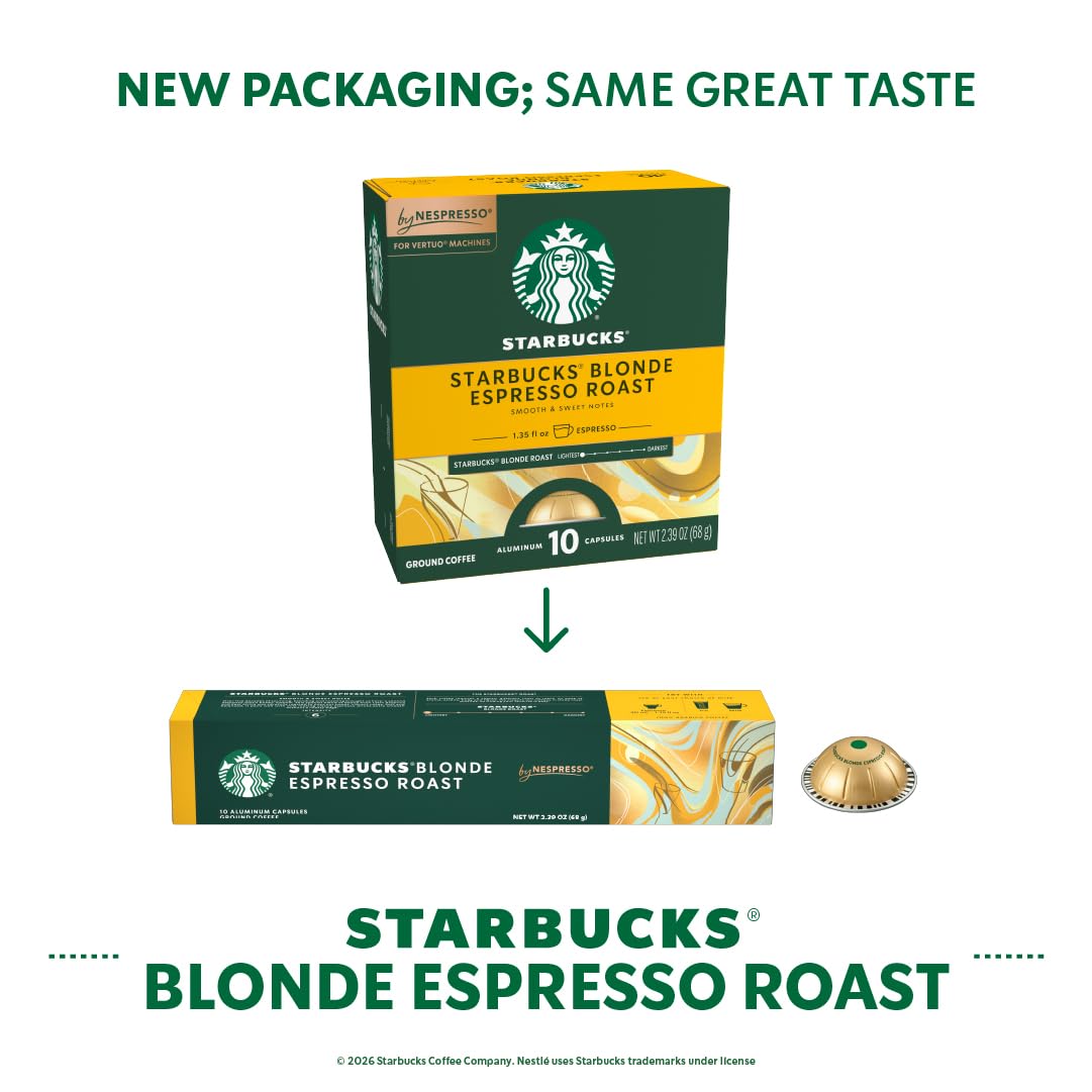 Enjoy the authentic Café taste of Starbucks coffee at home like never before on Nespresso Vertuo machines. Made with the finest quality Starbucks coffee that you know and love, Starbucks by Nespresso. Vertuo capsules are developed with Nespresso to work perfectly with the Vertuo system and are fully recyclable. Each cup of Starbucks blonde espresso roast blonde roast Coffee is smooth and sweet and made with 100% Arabica coffee beans. Authentically delicious perfection is just a cup away.