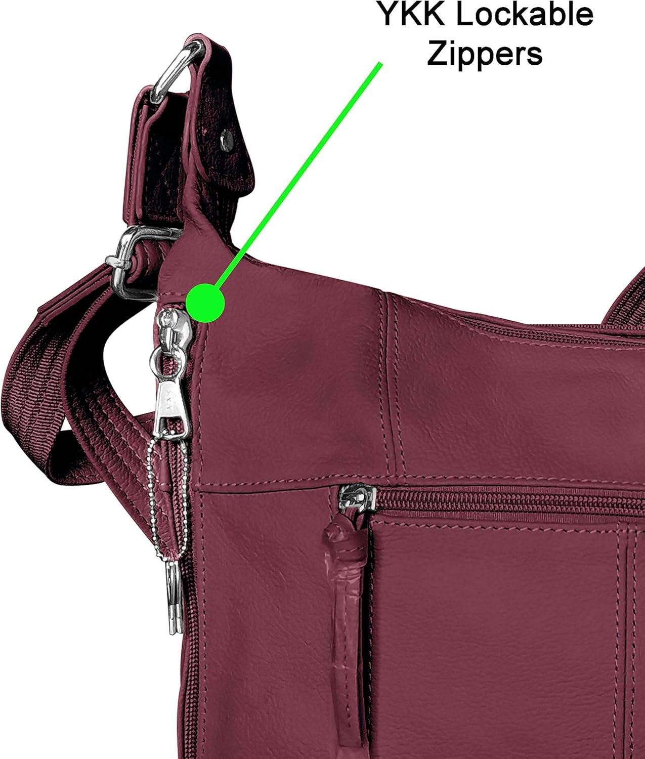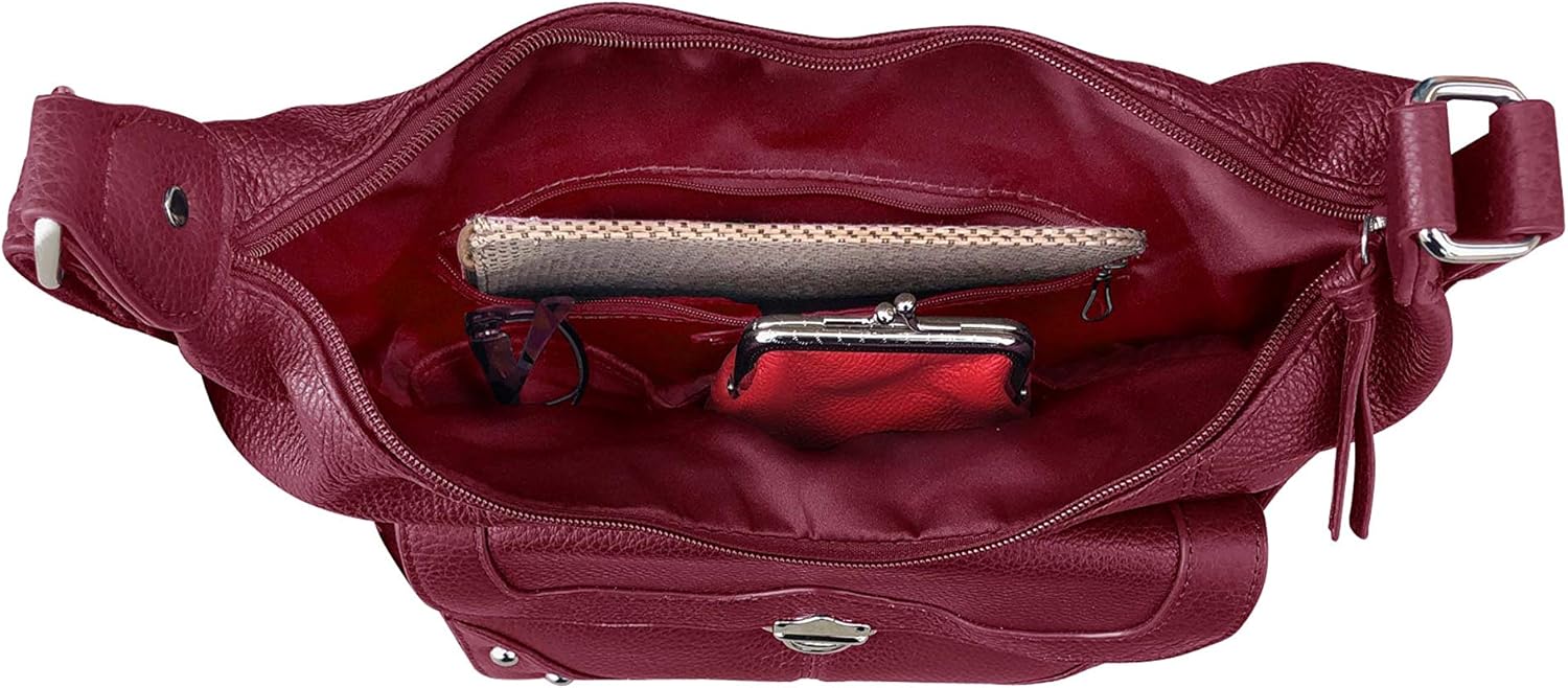 Stylish concealment purse is made using genuine cowhide leather and has wire reinforced adjustable shoulder straps. The CCW purse has dual gun entry for both right and left hand draw, as well as YKK lockable zippers for safety. Dimensions are 11"x 9"x 4" Concealment pocket size 7"x 12".