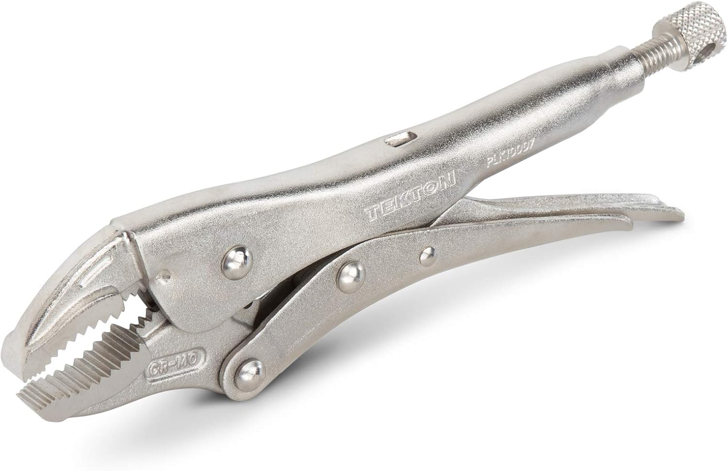 Tekton curved jaw pliers have a curved section of the jaw that locks onto hex-shaped bolts, rounded-off nuts, pipes, and square tubing with the aggressive bite of deep, sharp teeth. Easily set, release, and reposition the clamp with one hand and with more control than a traditional pinch-style lever. Get extra leverage and fine-tune your clamping force by inserting a screwdriver or hex key into the through-hole to create a T-handle. The jaws are made from 4140 chromium molybdenum steel, an alloy that offers toughness, machinability, and corrosion resistance. The teeth are hardened to 45–50 HRC and should not chip or strip even on fasteners up to Grade 8 or Class 12.9. The pliers have a durable, nickel-plated finish that protects against corrosion.