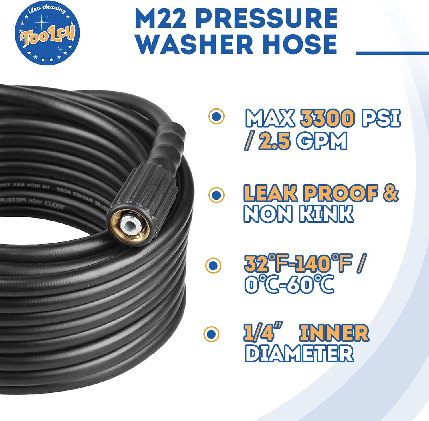 What's in the Package: 1 x 50 FT 1/4" Pressure Washer Hose, 1 x Pressure Washer Short Gun, 1 x 3/8" QC to M22-14mm Adapters, 1 x M22-14mm male to male extension coupler5 x Nozzle Tips Please reach out to us for electric pressure washer when leaking and any other technical support you need. (NOTE: Only fit for pressure washer. Can't be connected to faucet.)