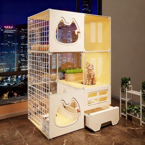 Introducing our innovative cat condo, thoughtfully designed for modern pet owners who prioritize their feline friends' comfort and well-being. This multi-functional cat house creates distinct zones for resting, eating, playing, and toileting, ensuring your cat enjoys a balanced lifestyle. The separated layout effectively reduces stress, minimizes litter tracking, and helps control odors, making it a perfect addition to any home. With its transparent design, you can effortlessly monitor your cat's behavior and mood while providing them with a safe and airy environment. This visibility fosters a sense of security, allowing your furry companion to feel relaxed and at ease. Whether you live in a cozy apartment or have multiple pets, this indoor cat playpen offers ample space for your cat to explore and unwind, even when you're busy working or out of the house. Our cat condo is more than just a shelter; it's a stylish and functional indoor home that enhances your living space while ensuring your cat's comfort and cleanliness. Available in various sizes, it fits seamlessly into any room, providing your cat with a dedicated area to thrive. **Product Sizes:** - 71×46×71 cm / 27.95×18.11×27.95 in - 71×46×106 cm / 27.95×18.11×41.73 in - 106×46×71 cm / 41.73×18.11×27.95 in - 106×46×106 cm / 41.73×18.11×41.73 in - 71×46×142 cm / 27.95×18.11×55.91 in - 106×46×142 cm / 41.73×18.11×55.91 in **Package Includes:** - Cat condo ×1 - Pull-out litter box ×1 - Cat bed ×1 - Food bowl ×1 **Notes:** - Slight measurement errors may occur. - Color tones may vary based on lighting or display. - Only items listed above are included; accessories shown in images are for display purposes only. Elevate your cat's living experience with our cat condo—a perfect blend of functionality, style, and comfort!