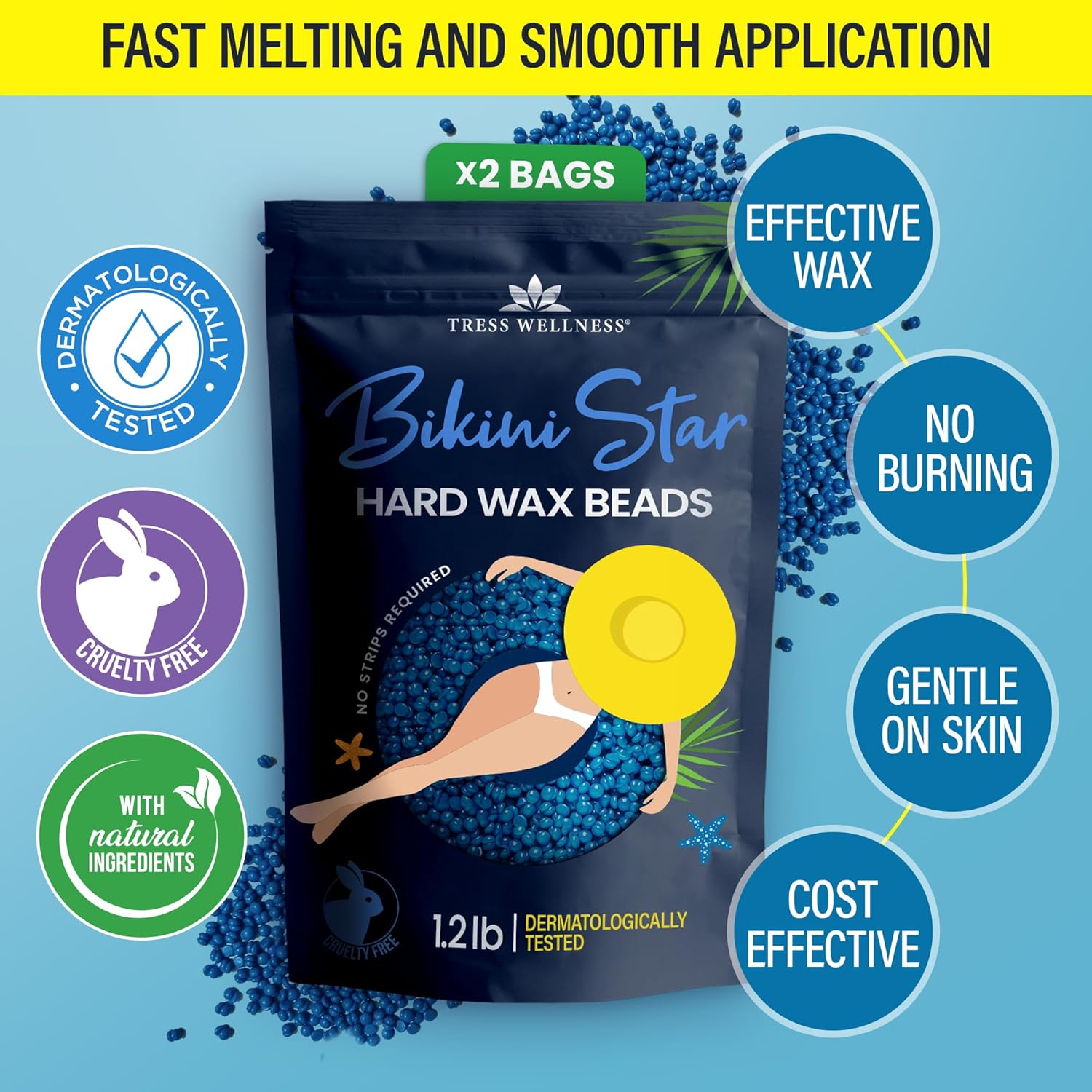 NO MORE PAINFUL HOT WAXES - Our specially formulated hard wax beads for hair removal can be used at your perfect temperature. Our smoothest formula strip free wax yet, will glide on for your smoothest home waxing application experience.. SPECIALIZED BIKINI WAX - Tress Wellness Brazilian hard wax is ideal for coarse hairs, making it perfect for your bikini and under-arm area. Our Hard wax will remove even the most stubborn of hairs. The blue wax beads are Tough on Hair, whilst being Soft on Skin.