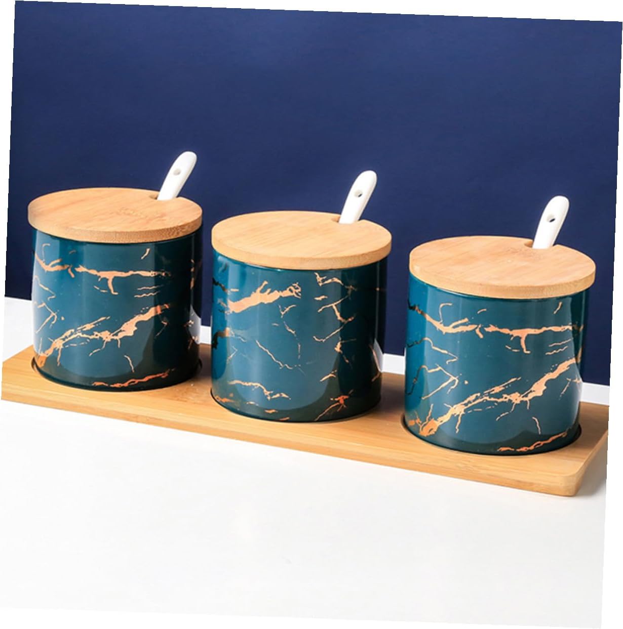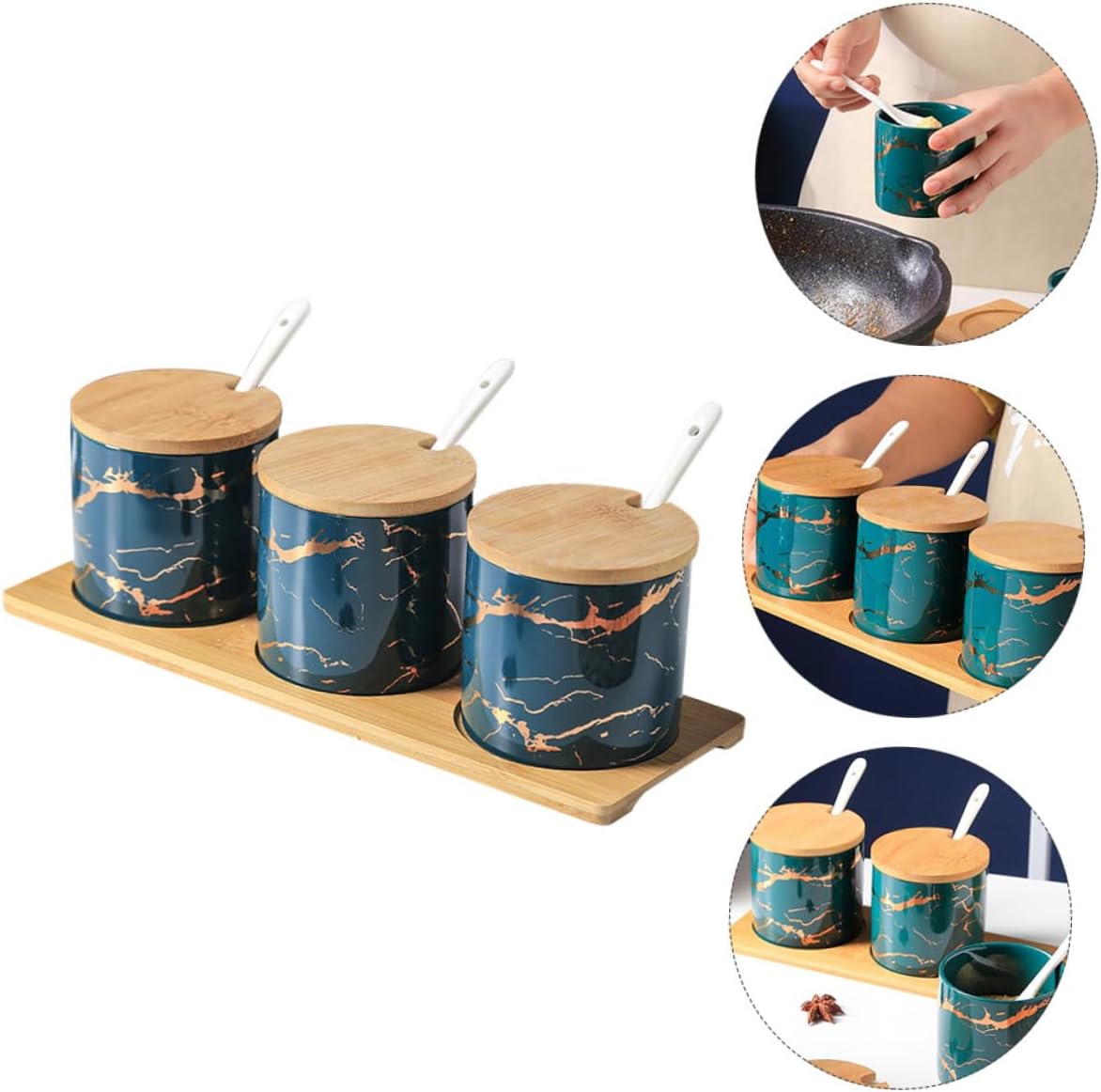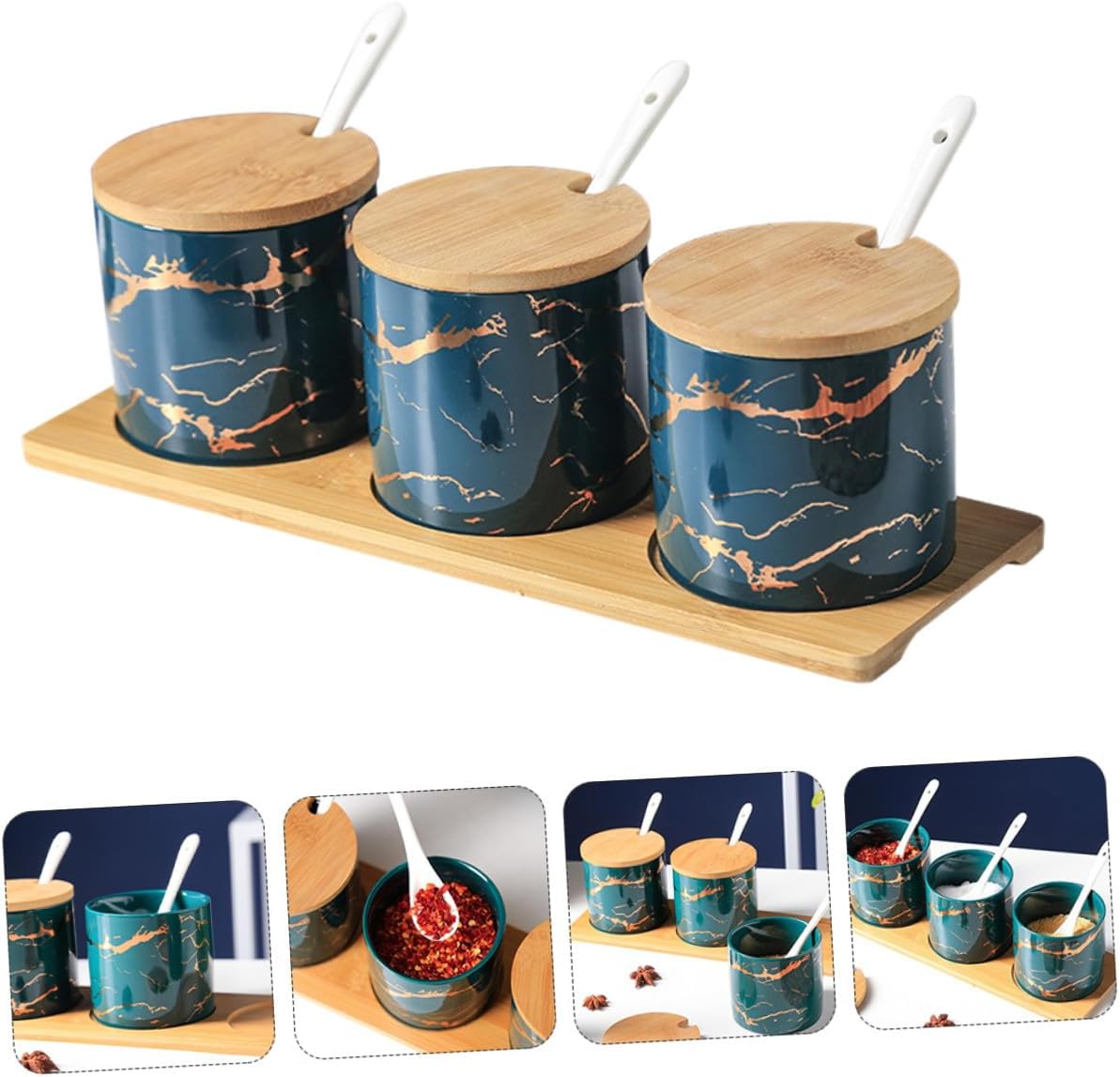 Package List 1 x set of Seasoning Can Features -Material: Ceramic, Wood. -Size: About 29.00X10.00X9.00cm/11.40X3.93X3.54inch. -Color:Multi -Product Info:Seasoning can set - The seasoning box comes with , lid and base, more convenient to use container seasoning. - It also can be used as a to friends or family at Housewarming day condiment jar with lids and spoons. - Great for picnic table, home kitchen, dining and restaurant kitchen seasoning containers. - Perfect for storing condiments, oil, vinegar, spices, seasoning, salt, peppers, snacks, and so on condiment cups with lids. - Simple but fashion, fits most of kitchen, decorating your cooking and dining environment ceramics seasoning jar.Goods Descriptioncondiment cups with lids This is a premium seasoning storage container.condiment jar Store your supplies and keep your kitchen tidy and safe.dressing & spice dispensers Can put seasonings in, such as salt, aginomoto and pepper , neat and convenient, easy to be taken care of.seasoning storage container Made of food-grade material, safe and