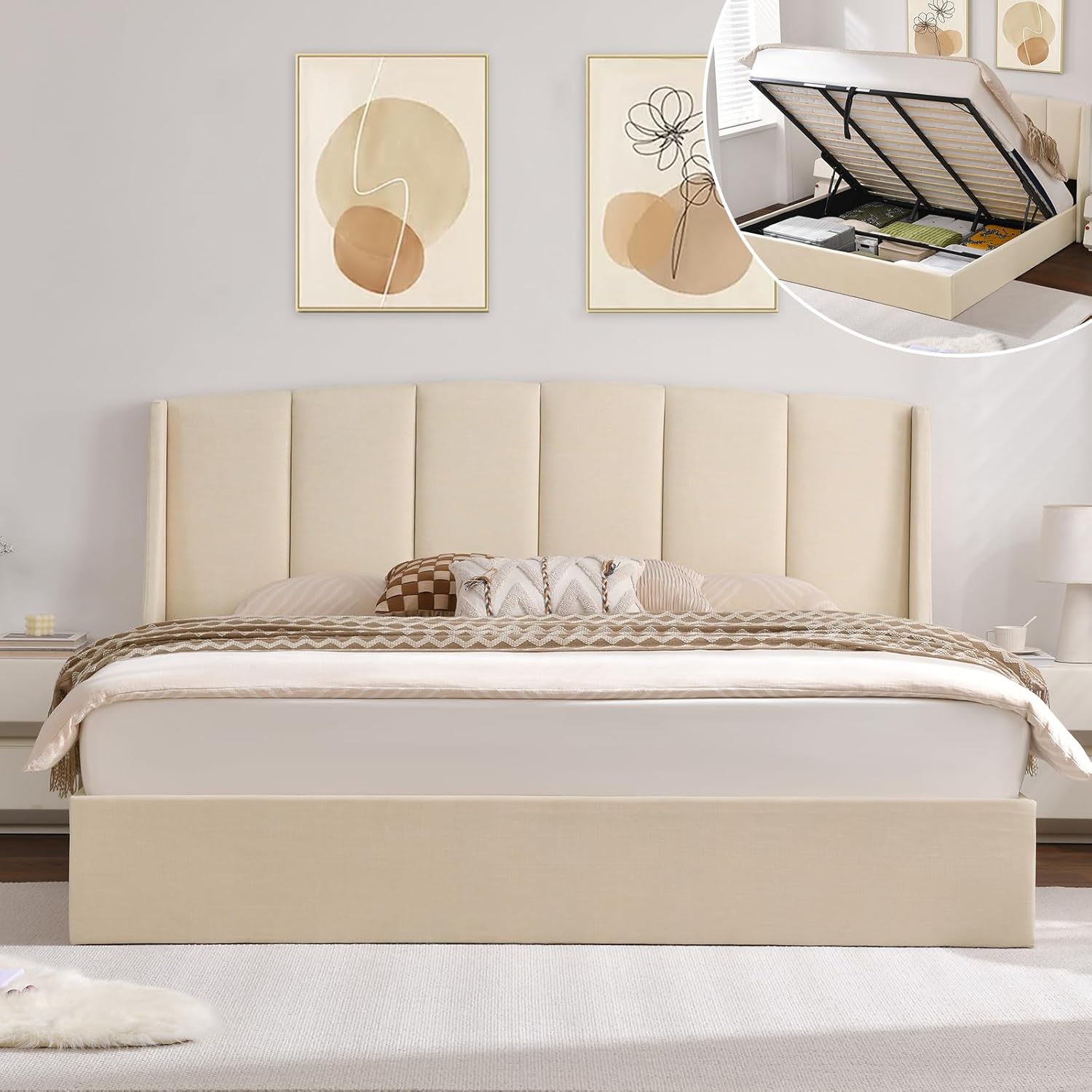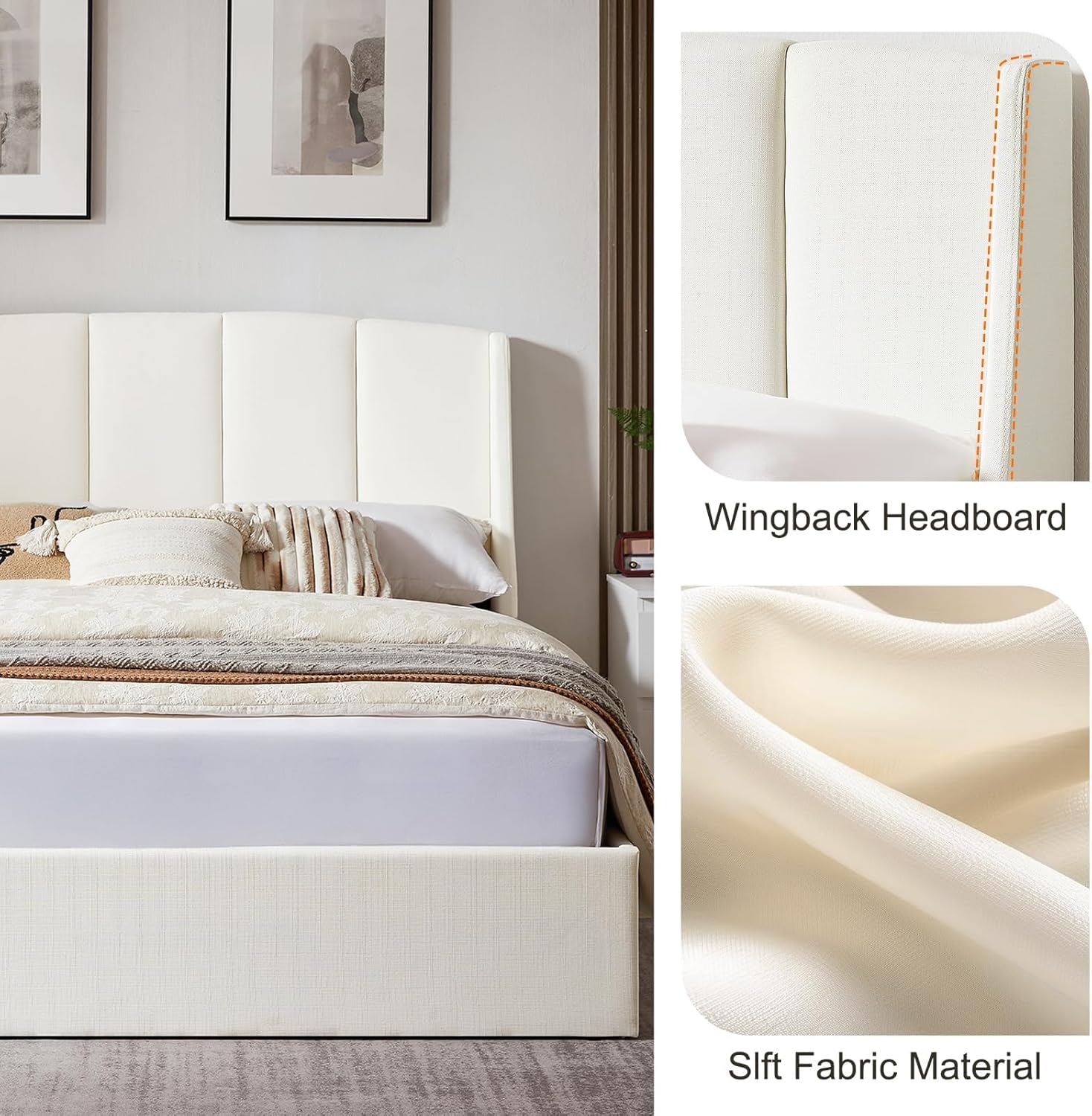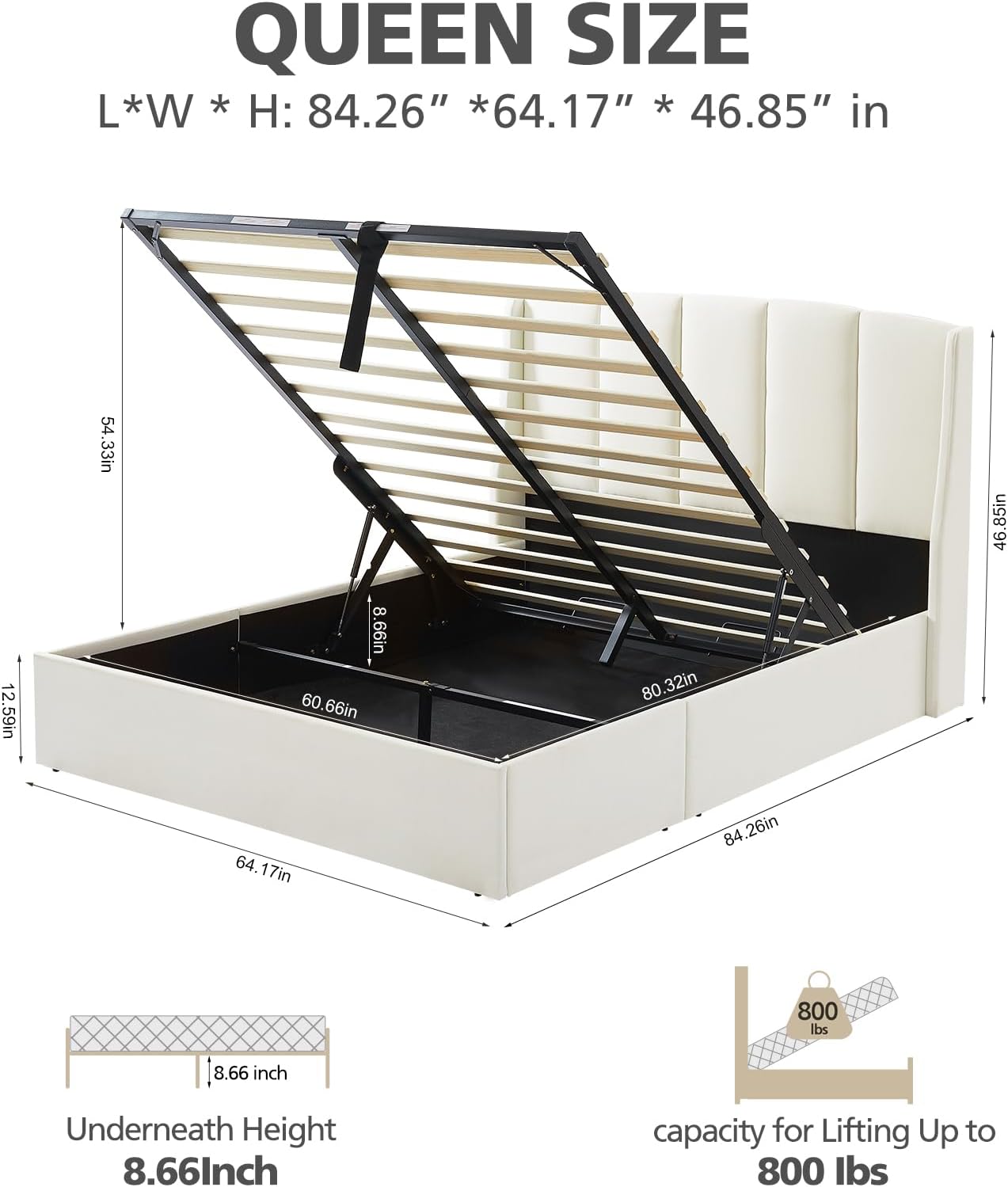 Introducing our lift up storage bed, designed to bring a blend of modern elegance and functional comfort to your bedroom. This bed frame features a sophisticated wingback headboard with vertical channel design, offering a chic aesthetic that complements any décor style. It offers excellent support and comfort, allowing you to recline effortlessly while reading or relaxing.The modern headboard with wingback will protect your mattress from sliding together with reserved embedment space around the bed frame, and stop your pillows from falling. This upholstered bed frame is made of high-quality plywood that is moisture-resistant and crack-resistant, ensuring long-lasting durability. It features 12 sturdy slats and 5 additional metal support legs, providing a reliable and secure foundation for a peaceful night's sleep. With a weight capacity of up to 800 lbs, it offers exceptional support and stability.Lift-up design allows large underneath space to get used. Ample under-bed storage can store extra bedding, clothing, shoes, and other items, dustproof cover keep your belongings out of the landfill and keep rooms tidy.Ideal for small bedrooms and apartments, this bed frame meets the storage needs of most families while maintaining a stylish appearance.This upholstered bed features an embedded design to prevent mattress displacement.The included slats mean there's no need for a box spring, and eva mute foam easy and quick assembly designed for reducing friction while eliminating strange squeaking noise to bring you a quiet sleep.The bed frame is designed for easy assembly, with clear instructions, labeled parts, and the necessary tools included. If you have any questions during the assembly process, please do not hesitate to contact us first, we will solve your problem within 24 hours.