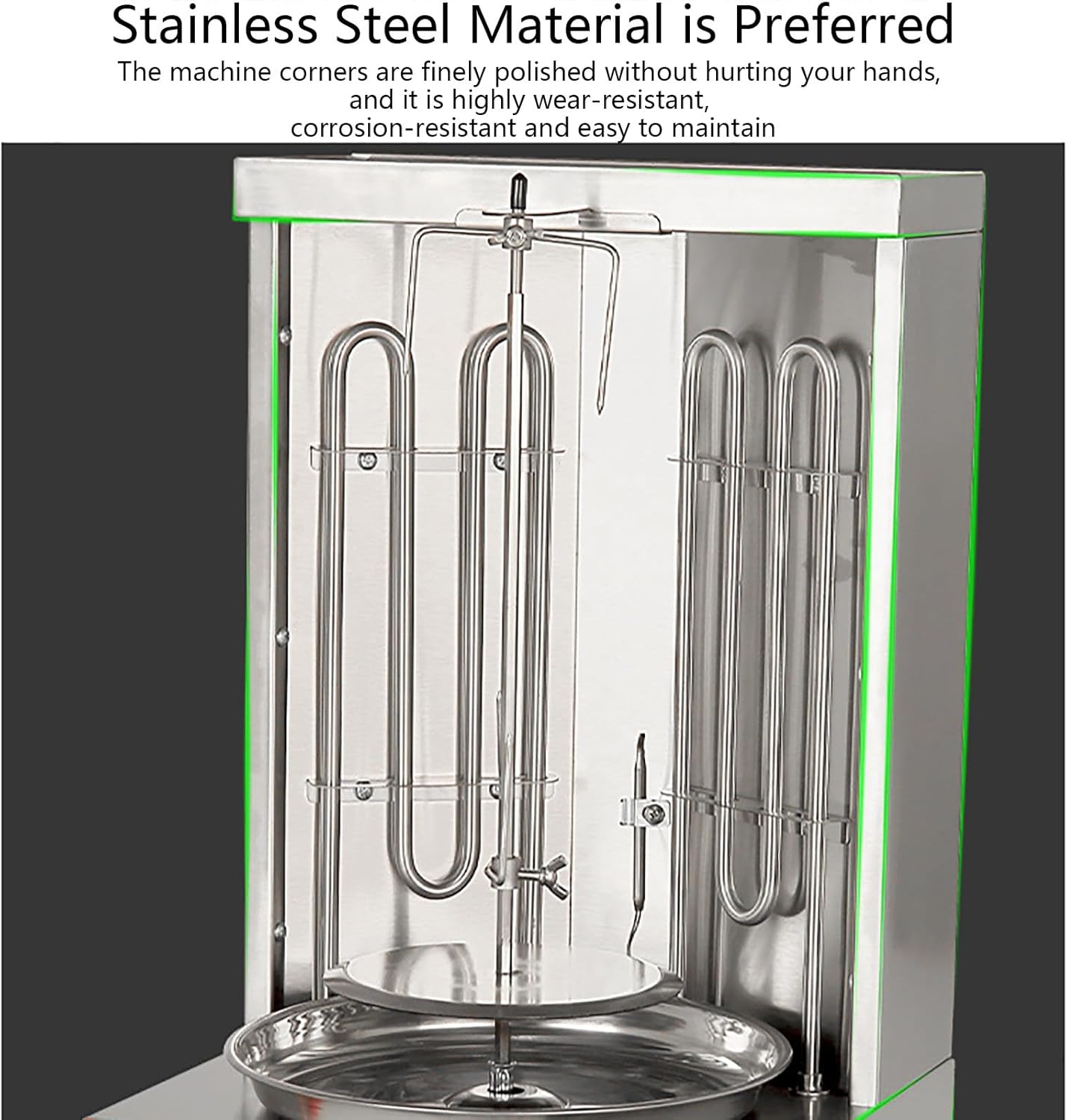 What makes the GESAIDES Shawarma Grill Machine so popular? 1. This electric shawarma grill machine uses electricity to bake meat layers, kebabs, turkey, and make masala safer and more conveniently 2. Heating element is designed with open structure, two heating tubes, up to three kilowatts of power, semi-circular housing helps to optimise energy use. 3. Vertical kebabs can cook from 1kg to 7kg of meat, ideals for family gatherings, picnics and commercial barbecues. 4. The kebab machine can be freely adjusted to a temperature range of 50-300°C, with LED lights indicating power and heating status. 5. Vertical kebabs are made of stainless steel with removable stainless steel skewer rack and oil tray, the oil tray collects oil and residue, easy to clean, easy to skewer, pick up and adjust the height of the meat. 6. Rotisserie Catch Pan, for Chicken Shawarma, Turkey Shawarma, Beef Shawarma, Lamb Shawarma, Gyros, Doner Kebab or Kabob. Specification Name: Vertical rotisserie oven grill Voltage: 110/220V Power: 3000W Temperature: 50-300℃ Material: Stainless steel Size: 295×265×485mm Weight: 5kg Packing List Electric Gyro Grill machine × 1 Meat tray × 1