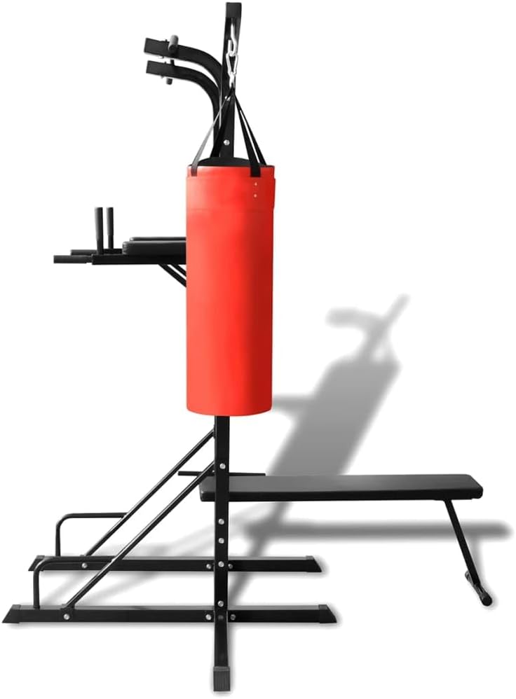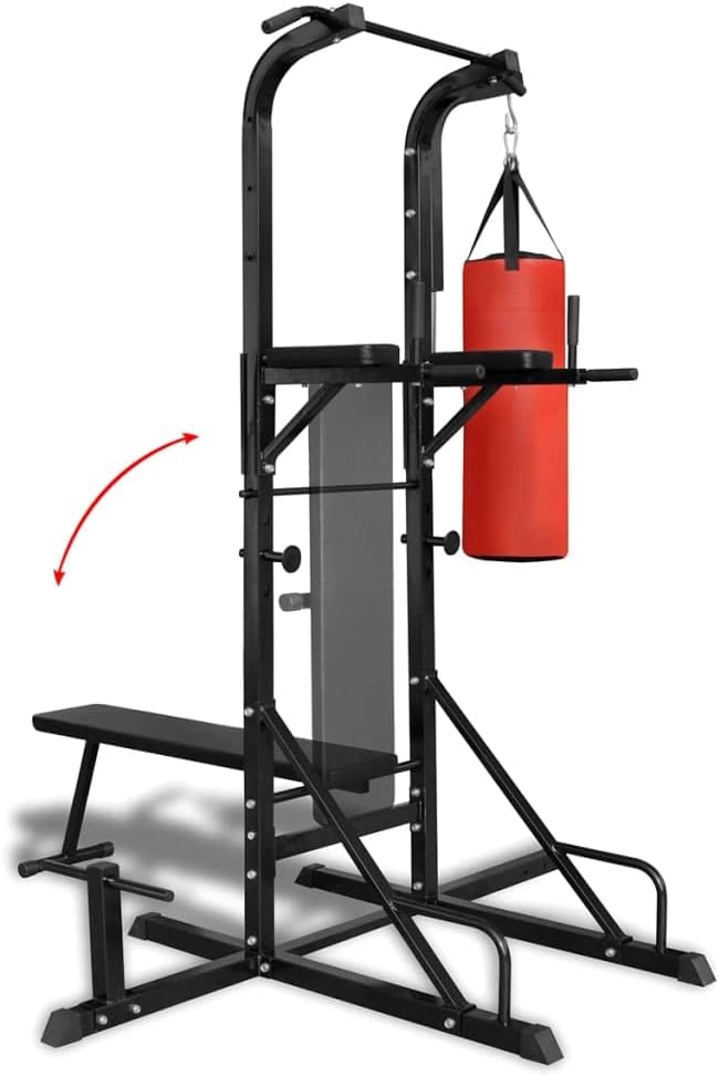 This multi-functional power tower with a sit-up bench and a boxing bag is suitable for intensive exercises like boxing as well as bodyweight exercises like pull-ups (narrow & wide grip), dips, chin-ups, knee raises and sit-ups, which will tone up your chest, back, biceps, triceps and abs, increase your natural upper body strength and enhance muscle mass. This multi-functional sit-up bench is finished with a black powder coating and black PU cover on the padded bench and armrests. The sit-up bench has a maximum load of 220 lb, and the base and frame are very stable. Please note that this delivery does not contain sand for the boxing bag.Size: 5′ 11″ x 4′ 1″ x 7′ 1″ (L x W x H)Color: Black Material: Power-coated steel + artificial leather cushionBoxing bag size: 1′ x 3′ 7″ (Φ x H)Max. load: 220 lbFeatures:1 x Chin-up bar1 x Boxing bag1 x Sit-up benchSturdy basePlease note that sand for the boxing bag is not providedFabric: Polyurethane: 100%