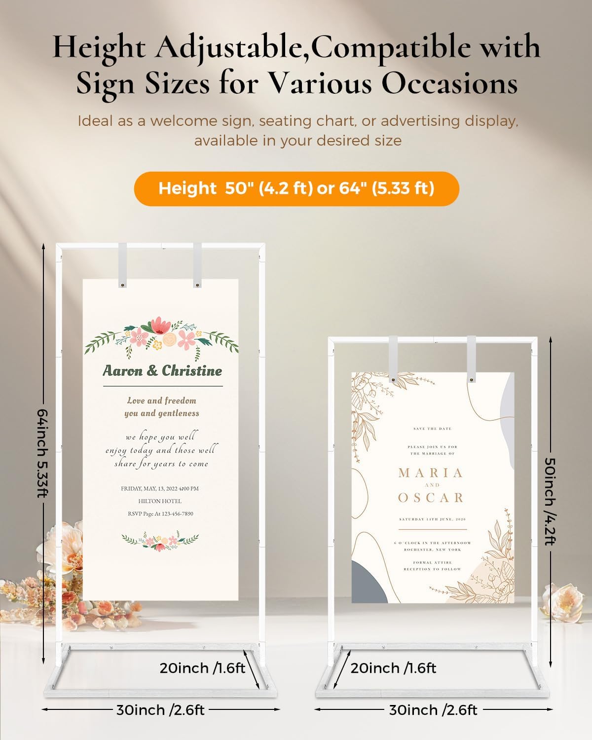 STAND OUT IN STYLE and MAKE YOUR WEDDING UNFORGETTABLE with the Furosa Adjustable Wedding Sign Holder. At 30" wide, this versatile easel stand for sign offers two height options: 50" or 68"/5.7 ft, making it perfect for showcasing your welcome sign or a larger seating chart. The sleek black finish complements any wedding decor, ensuring your sign stands out. (Physical sign not included - Digital download available) MAKE EVENT PLANNING EASY with our versatile sign holder stand and design bundle. Including templates for weddings, bridal showers, birthdays, and baby showers, this stand is perfect for any occasion. With adjustable height options, you can easily switch out sign content. Plus, the sleek design complements various styles, from Boho chic to minimalist and elegant, ensuring it fits perfectly with your event theme. HANG YOUR WELCOME SIGN SECURELY with the included wedding leather hanging straps. These durable straps with screws hold signs up to 0.4" thick, including foam boards and acrylic, ensuring a stable display. Perfect for welcome signs, seating charts, and more! The set includes BLACK and WHITE straps, offering versatile options to match your event’s style. BUILT TO WITHSTAND THE ELEMENTS: Our easels for display is crafted from heavy-duty iron, designed to endure unexpected rain or harsh sunlight. With its wide, stable base, you can rest assured that your welcome sign holder will stay secure and upright, no matter the weather conditions, ensuring your event goes off without a hitch. ENJOY EXCEPTIONAL SERVICE AND EASY ASSEMBLY with our easy guide and helpful HOW-TO VIDEO. Whether you're an event planner or getting married, this easel stand for sign sets up quickly, giving you more time to enjoy your event. We stand behind our products for lifetime —if you have any issues,contact us for a fast response, quicker than Amazon’s official service.