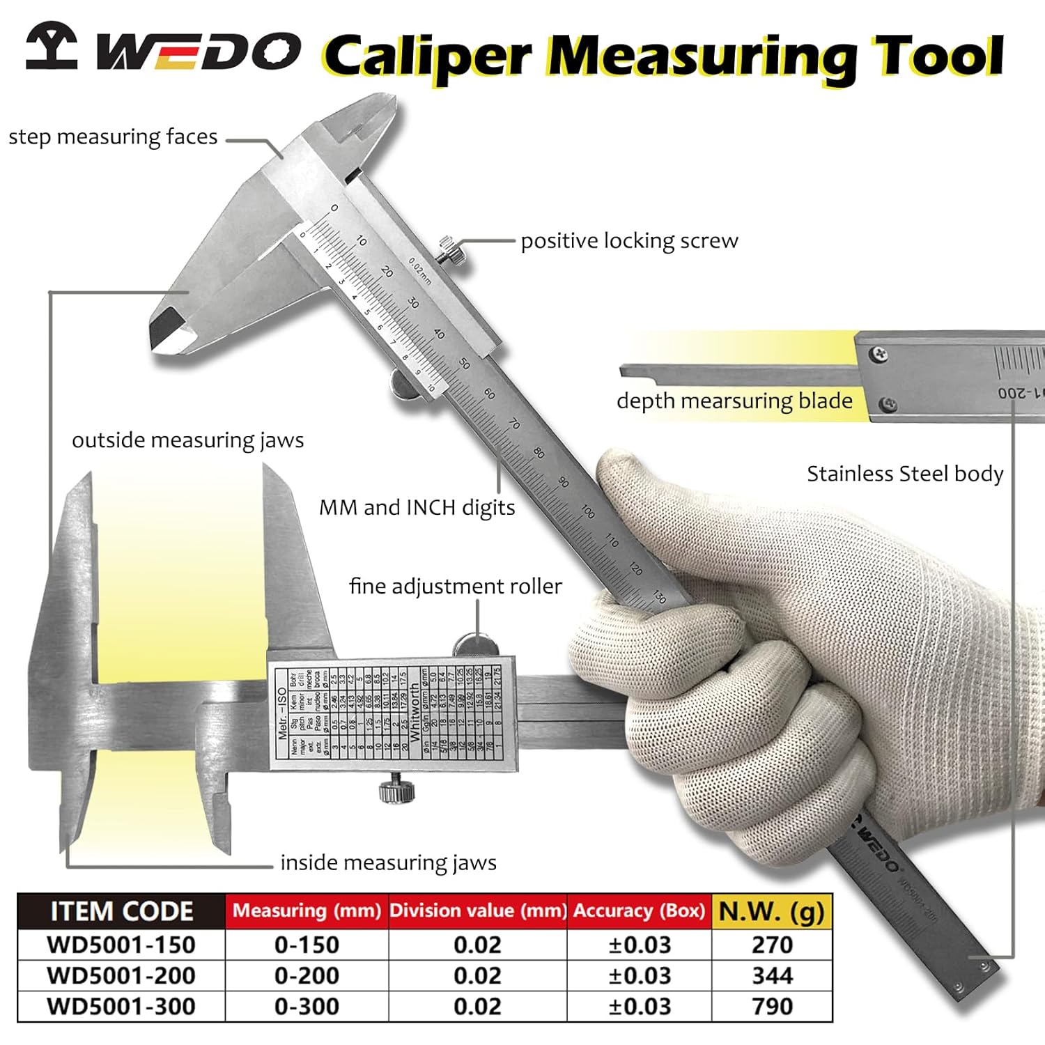 【Precise measurement】:The Caliper has Precise measurement. Measurement range:0-8''/0-150mm; Division value:0.02mm; Accuracy:±0.03mm. Perfect and accurate caliper measuring tool for household or DIY measurement. Please choose stainless steel caliper for more accurate measuring.【Measuring mode】: This caliper can be used to Measure inside and outside diameter, depth and step with two sets of jaws and a probe. Inch/mm conversion: One button quick switch between two units: inch and millimeter, definitely save your time.【High Quality Material】: The body of the caliper is constructed using finely polished stainless steel with a knurled thumb roller and locking screw that ensures smooth sliding and accurate positioning when taking measurements.【Advantage】:The caliper’s ruler body has good anti-wear and performance. Widely used for the measurement of various machining dimensions. Laser etched precise scales are clear and easy to read.【Service】: The caliper has been exported to more than 100 countries and regions. To enhance customers’ satisfaction, we set up service centers in Germany, Russia, South Korea, Singapore, Canada, the United States, the united Arab emirates, in order to provide timely after-sales service.